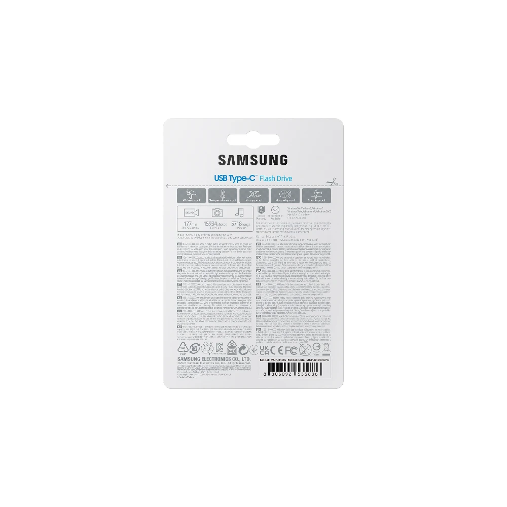 Samsung MUF-64DA. Capacity: 64 GB, Device interface: USB Type-C, USB version: 3.2 Gen 1 (3.1 Gen 1), Read speed: 400 MB/s. Form factor: Cap. Weight: 3.4 g. Product colour: Blue