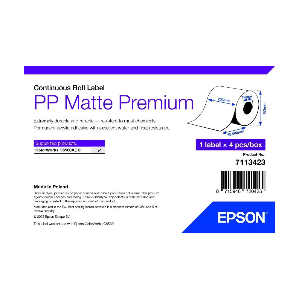 Epson 7113423. Product colour: White, Label type: Self-adhesive printer label, Type: Continuous label. Label width: 20.3 cm, Sheet length: 55 m, Maximum roll diameter: 15.2 cm. Labels per pack: 4 pc(s), Labels per roll: 1 pc(s). Country of origin: Poland