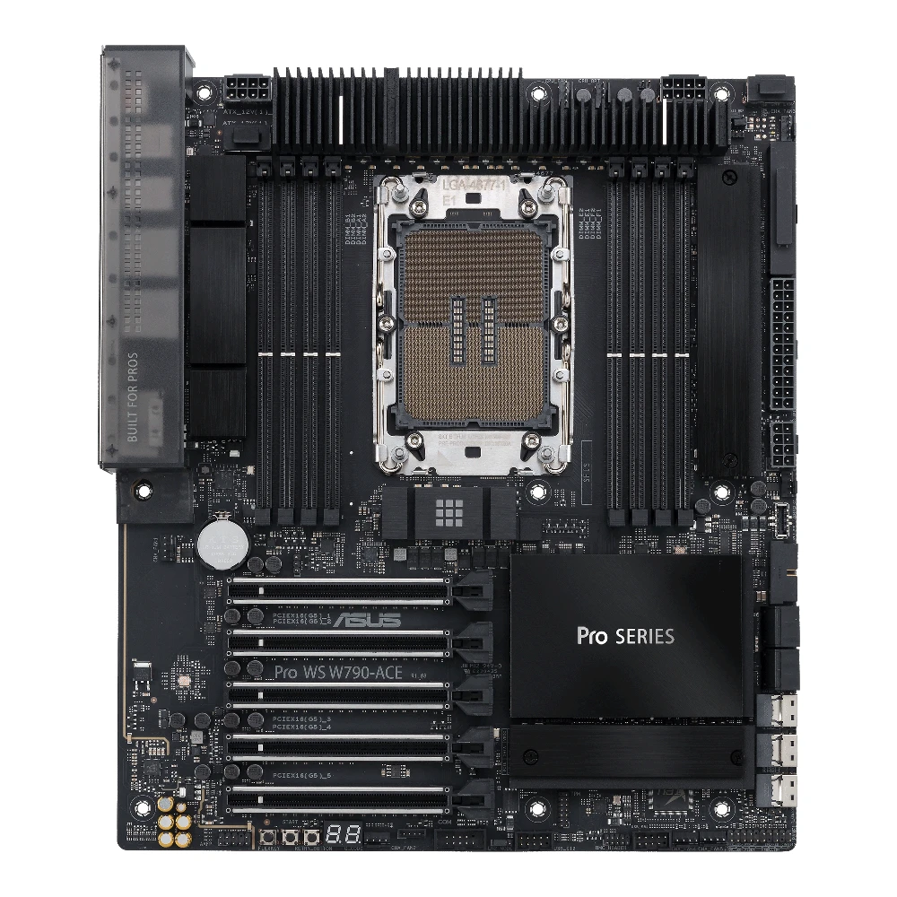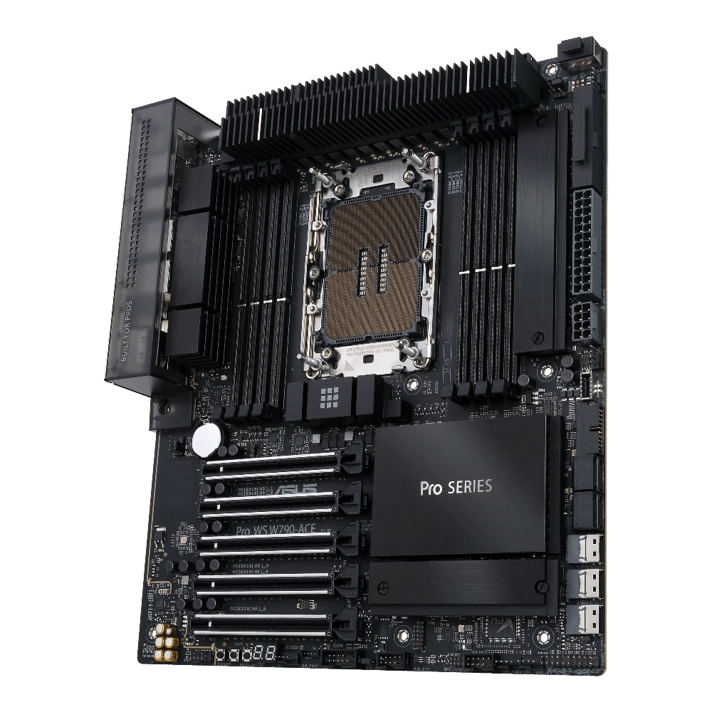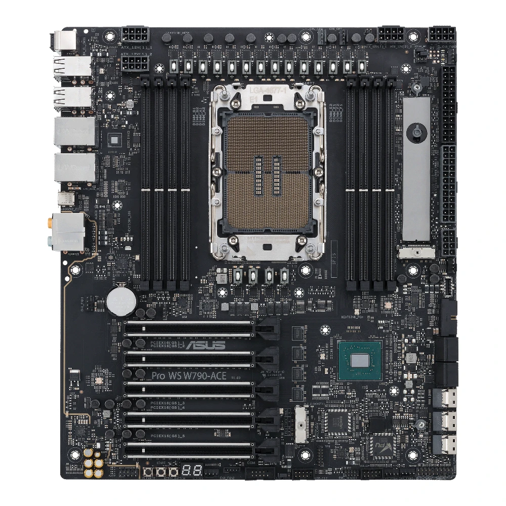 ASUS PRO WS W790-ACE. Processor manufacturer: Intel, Processor socket: LGA 4677, Compatible processor series: Intel Xeon W. Supported memory types: DDR5-SDRAM, Maximum internal memory: 2.05 TB, Memory slots type: DIMM. Supported storage drive interfaces: M.2, SATA III, Supported storage drive types: HDD & SSD, RAID levels: 0, 1, 5, 10. Ethernet interface type: 2.5 Gigabit Ethernet, 10 Gigabit Ethernet, Fast Ethernet, Gigabit Ethernet. Component for: Workstation, Motherboard chipset family: Intel, Motherboard chipset: Intel W790