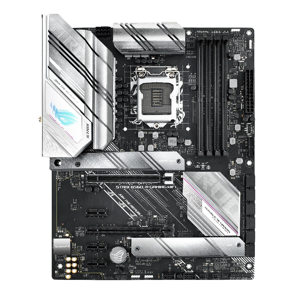 A striking silver white finish and contrasting Aura-RGB-illuminated glitch-effect logo give ROG Strix B560-A Gaming WiFi a bold aesthetic that immediately catches the eye. Parallel strakes and dotted text on the aluminum I/O shroud, M.2 and PCH heatsinks echo the ROG Strix fundamentals of speed, diversity and attitude to tie the whole theme together.