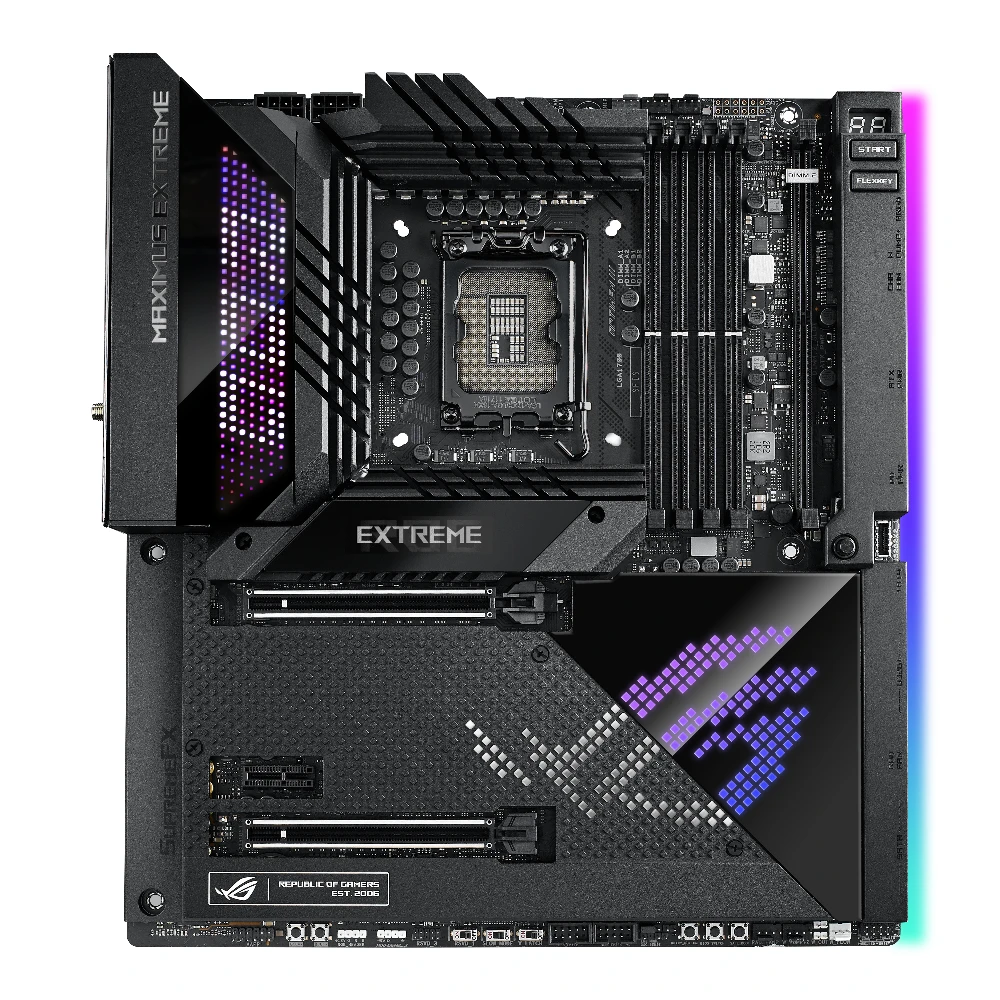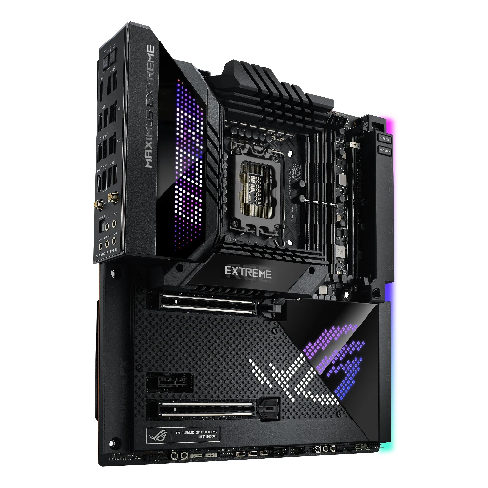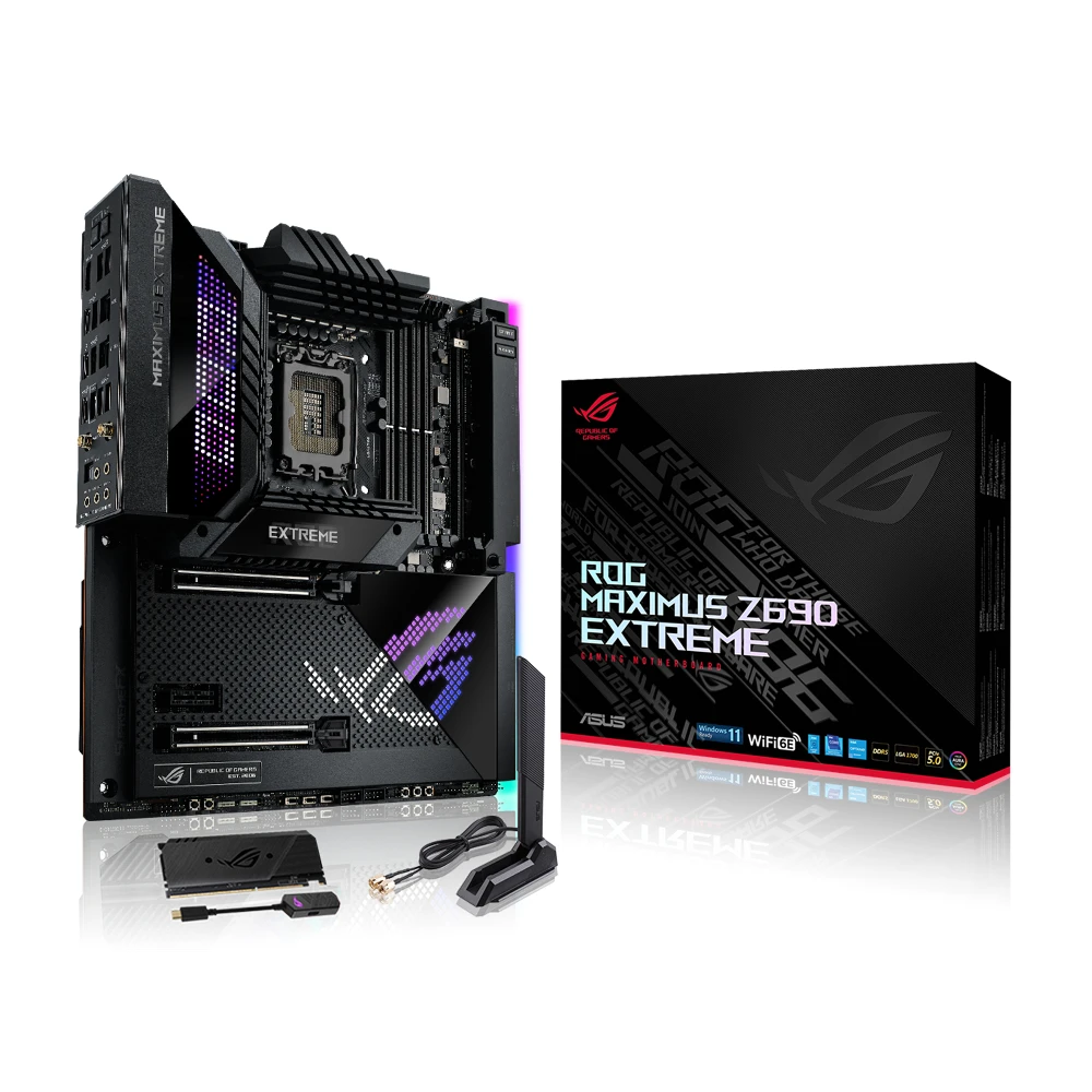 ASUS ROG MAXIMUS Z690 EXTREME. Processor manufacturer: Intel, Processor socket: LGA 1700, Compatible processor series: Intel? Celeron?, Intel? Core? i3, Intel? Core? i5, Intel? Core? i7, Intel? Core? i9,.... Supported memory types: DDR5-SDRAM, Maximum internal memory: 128 GB, Memory slots type: DIMM. Supported storage drive interfaces: M.2, SATA III. Ethernet interface type: 2.5 Gigabit Ethernet, 10 Gigabit Ethernet, Top Wi-Fi standard: Wi-Fi 6E (802.11ax), Wi-Fi standards: Wi-Fi 6E (802.11ax). Component for: PC, Motherboard form factor: Extended ATX, Motherboard chipset family: Intel