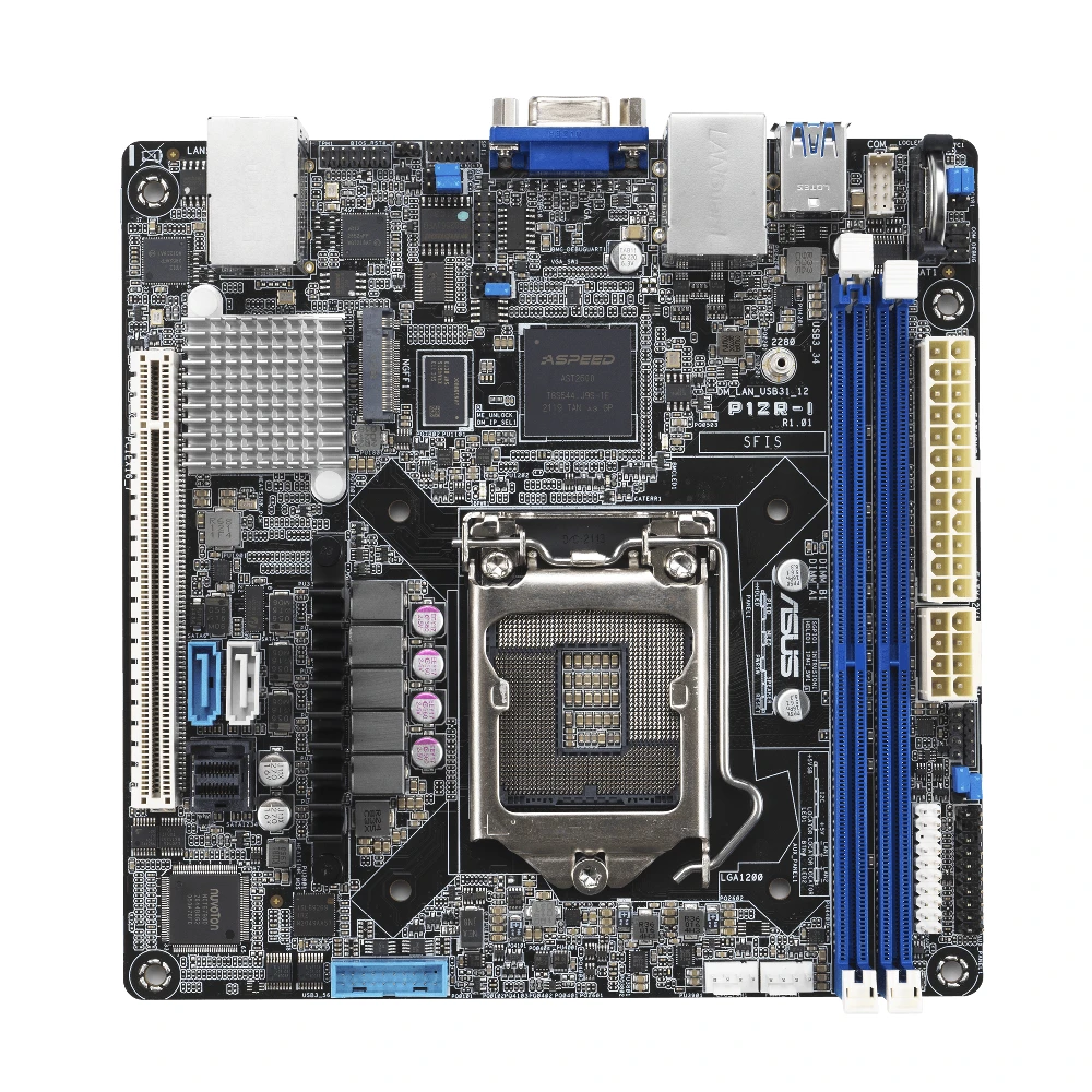 ASUS P12R-I ASMB10. Processor manufacturer: Intel, Processor socket: LGA 1200, Compatible processor series: Intel? Pentium?, Intel Xeon E. Supported memory types: DDR4-SDRAM, Maximum internal memory: 64 GB, Memory slots type: DIMM. Supported storage drive interfaces: M.2, SATA III. Graphics card family: ASPEED, Graphics card: AST2600, On-board graphics card memory: 64 MB. LAN controller: Intel? I210-AT
