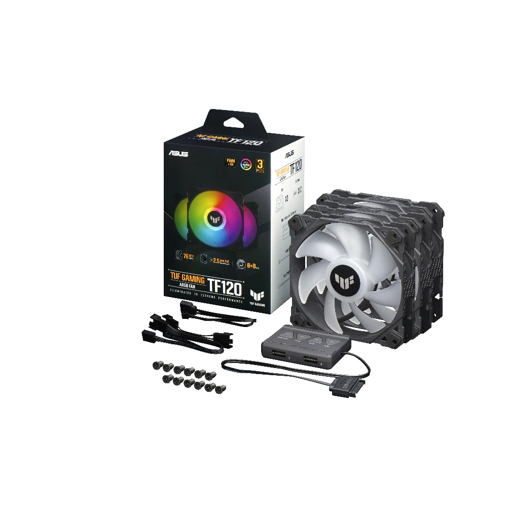 ASUS TUF Gaming TF120 ARGB Fan - Triple Fan Kit with ARGB Controller. Type: Air cooler, Fan diameter: 12 cm, Rotational speed (min): 250 RPM, Rotational speed (max): 1900 RPM, Noise level (high speed): 29 dB, Maximum airflow: 76 cfm. Width: 120 mm, Depth: 25 mm. Product colour: Black