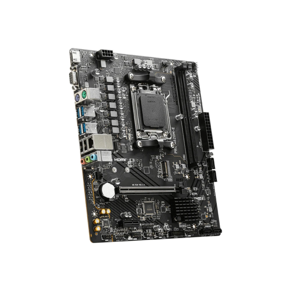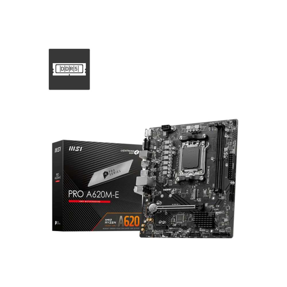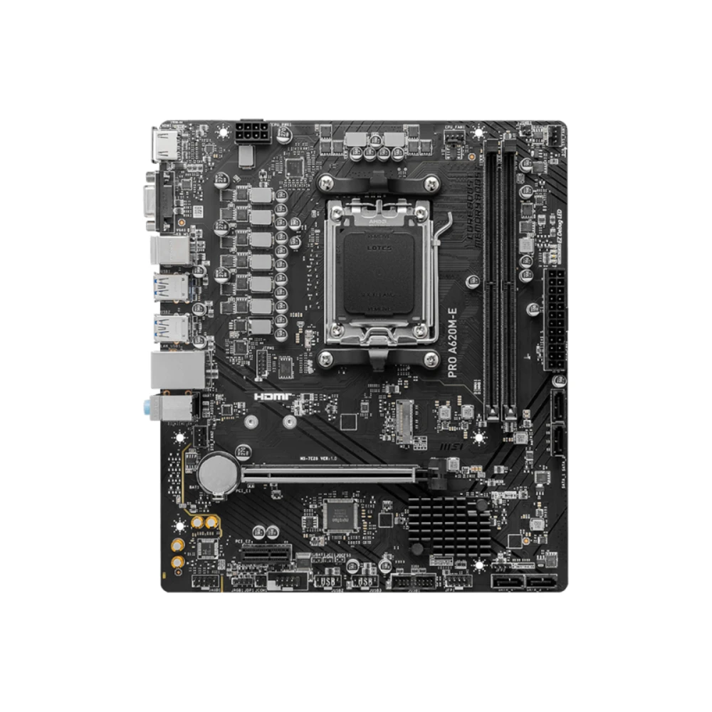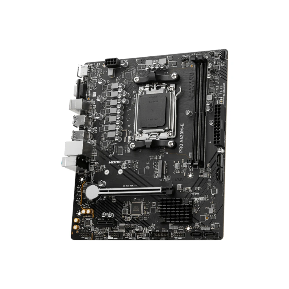 Supports AMD Ryzen 7000 , AM5, 2x DDR5 96GB Max, 1DPC 1R 6800MHz Max, 1DPC 2R 6000MHz Max, Dual-Channel, non-ECC, un-buffered, AMD EXPO, 1x HDMI 2.1, 4k 60Hz, 1x VGA, 2048x1536 50Hz, 1x PCI-E x16 4.0, 1x PCI-E x1 3.0, 1x M.2, 4x SATA 6G, 6x USB 2.0, 6x USB 3.2 Gen.1 Type-A, Realtek ALC897, 7.1-Channel, High Definition Audio, 1x ATX_PWR, 1xCPU_PWR, 1x CPU Fan, 2x System Fan, 2x JFP, 1x JCI, 1x JAUD, 1x JCOM, 1x RGB LED, 1x TPM 2.0, 4x USB 2.0, 2x USB 3.2 Gen1 Type A,4x EZ Debug LED, mATX 211mmx243.84mm MSI PRO A620M-E. Processor manufacturer: AMD, Processor socket: Socket AM5, Compatible processor series: AMD Ryzen™ 7. Supported memory types: DDR5-SDRAM, Maximum internal memory: 96 GB, Memory slots type: DIMM. Supported storage drive interfaces: M.2, PCI Express, SATA, Supported storage drive types: HDD & SSD, RAID levels: 0, 1, 10. Maximum resolution: 3840 x 2160 pixels. USB connector type: USB Type-A BUSINESS ELEGANCE