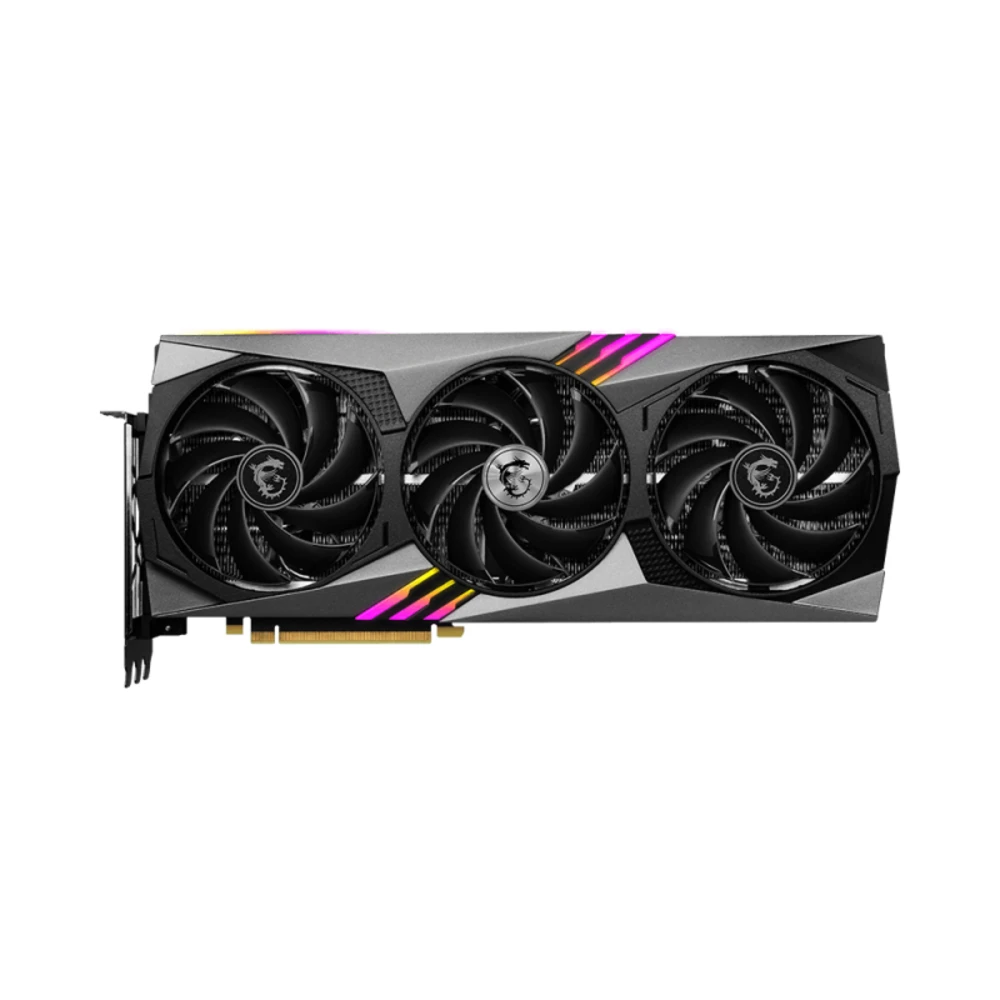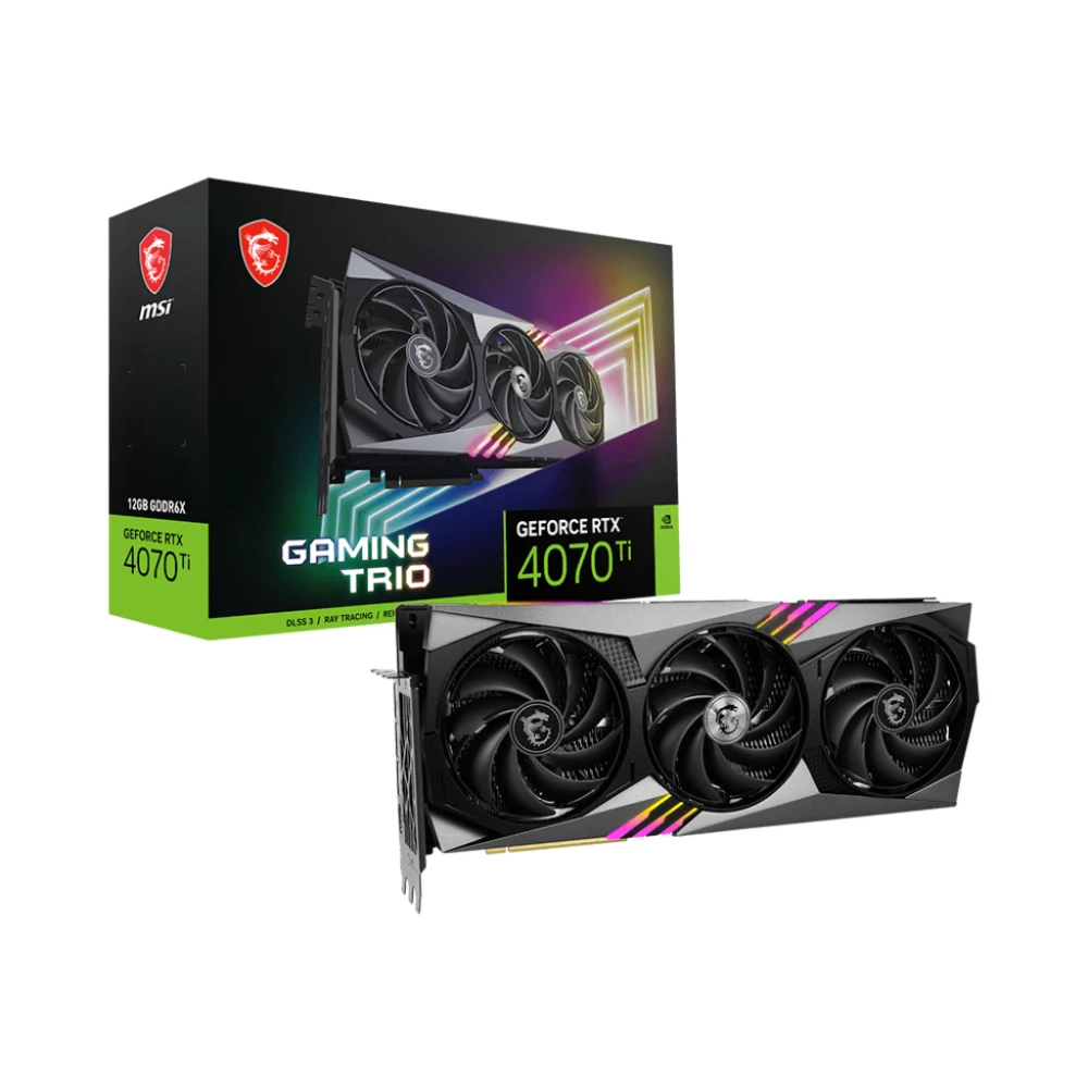 MSI GeForce RTX 4070 Ti GAMING TRIO 12G. Graphics processor family: NVIDIA, Graphics processor: GeForce RTX 4070 Ti, Processor frequency: 2625 MHz. Discrete graphics card memory: 12 GB, Graphics card memory type: GDDR6X, Memory bus: 192 bit. Maximum resolution: 7680 x 4320 pixels. OpenGL version: 4.6. Interface type: PCI Express 4.0. Cooling type: Active, Number of fans: 3 fan(s)