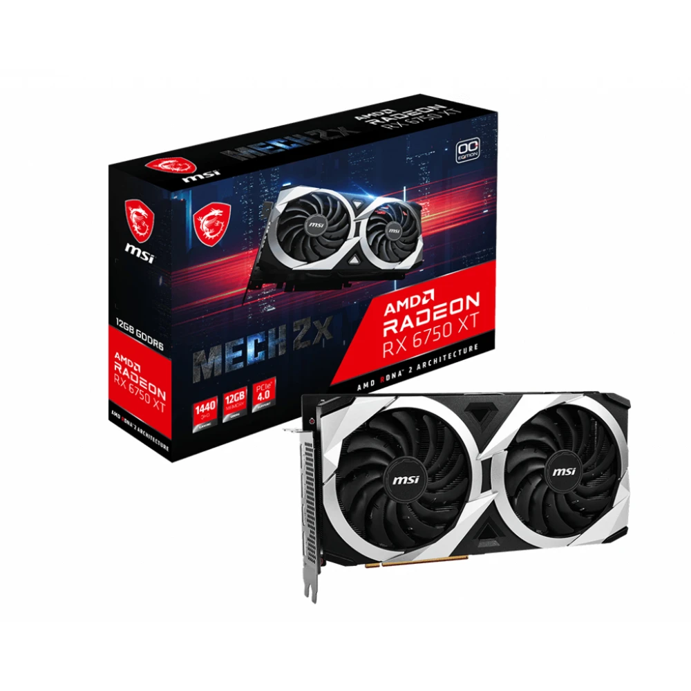 MSI Radeon RX 6750 XT MECH 2X 12G OC. Graphics processor family: AMD, Graphics processor: Radeon RX 6750 XT. Discrete graphics card memory: 12 GB, Graphics card memory type: GDDR6, Memory bus: 192 bit, Memory clock speed: 18000 MHz. Maximum resolution: 7680 x 4320 pixels. DirectX version: 1?2 Ultimate, OpenGL version: 4.6. Interface type: PCI Express 4.0. Cooling type: Active, Number of fans: 2 fan(s)