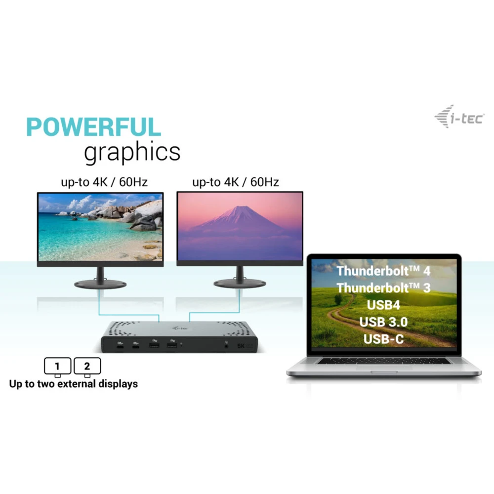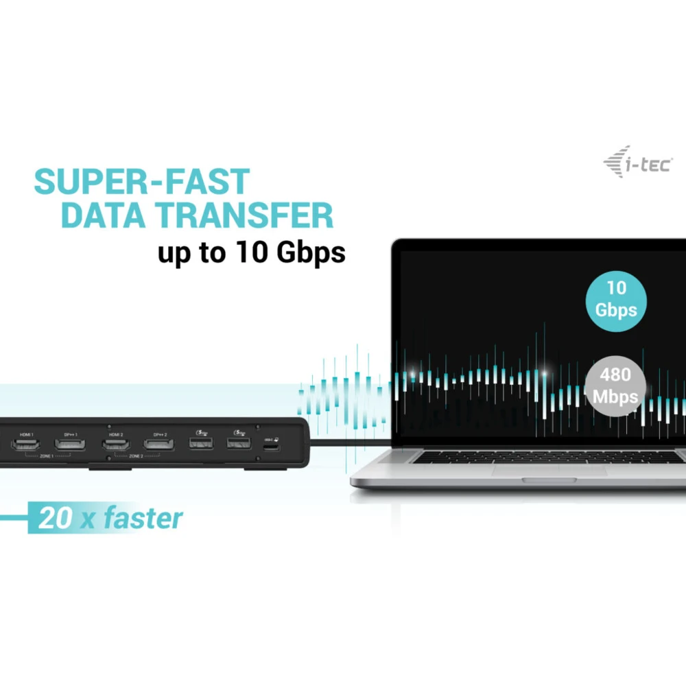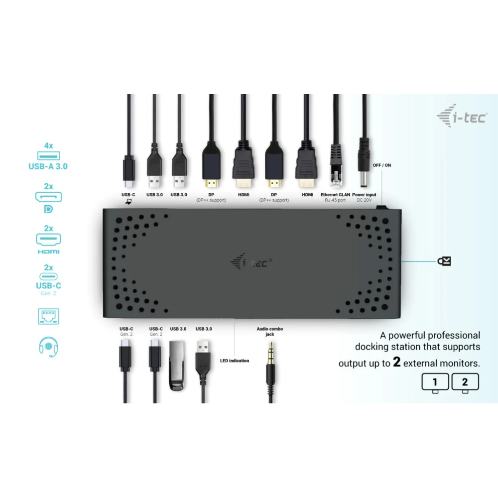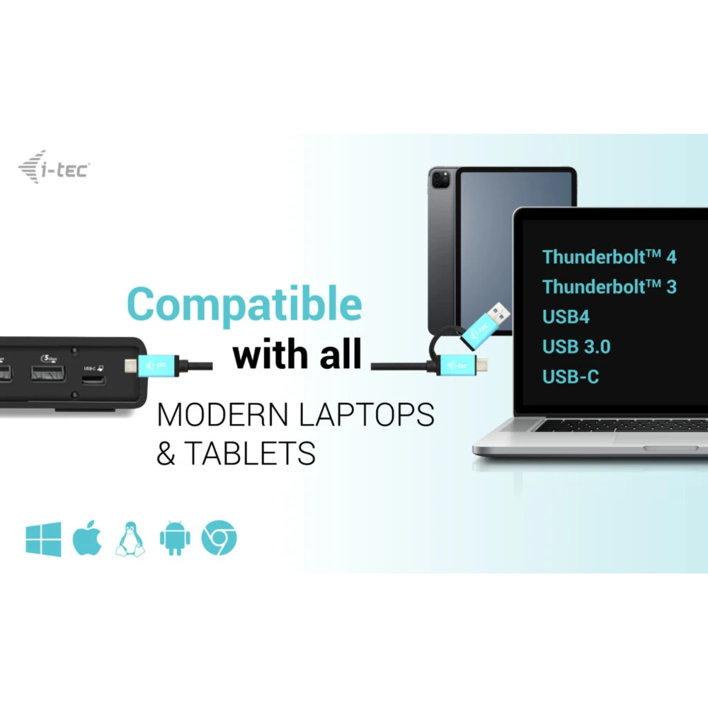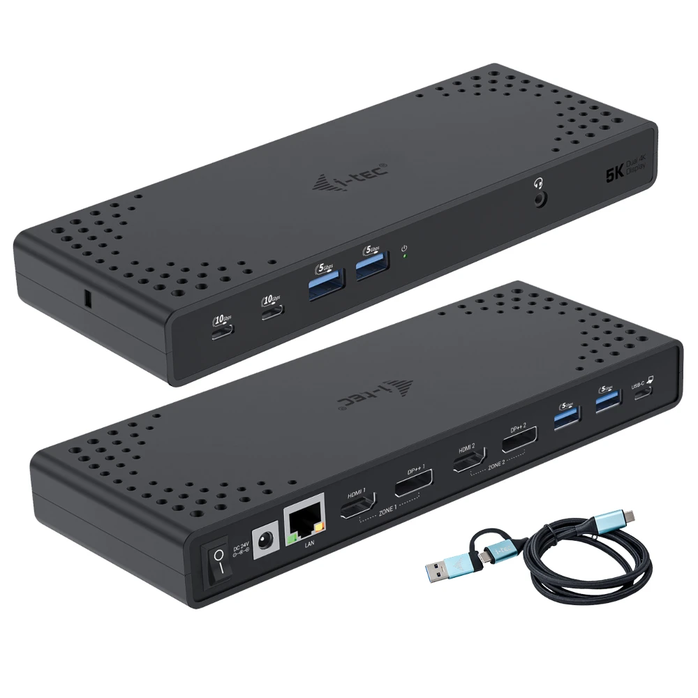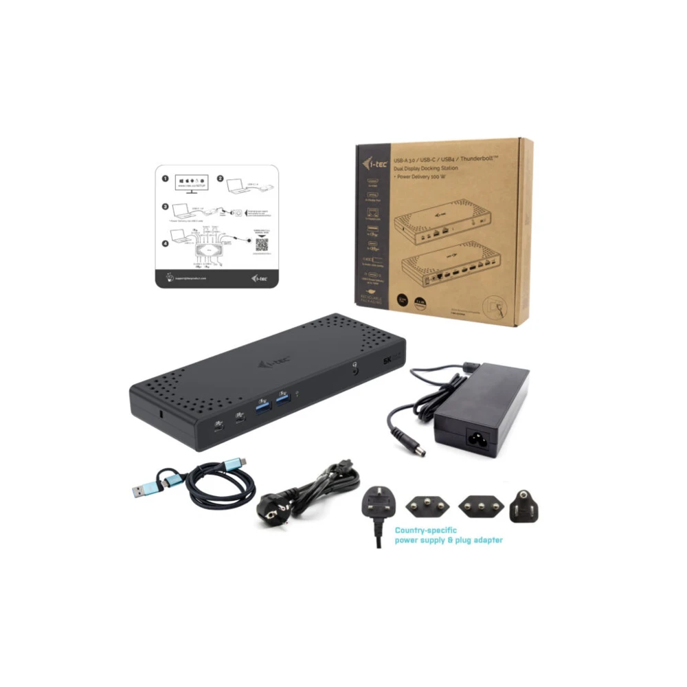 i-tec USB 3.0 / USB-C / Thunderbolt 3 Dual Display Docking Station Gen2 + Power Delivery 100W. Connectivity technology: Wired, Host interface: USB 3.2 Gen 1 (3.1 Gen 1) Type-C, USB Power Delivery up to: 100 W. Ethernet LAN data rates: 10,100,1000 Mbit/s. Product colour: Black, Data transfer rate: 10 Gbit/s, Maximum digital resolution: 5120 x 2880 pixels. Output voltage: 20 V, Output current: 6.5 A, Power cable length: 1.5 m. Other operating systems supported: Android, ChromeOS