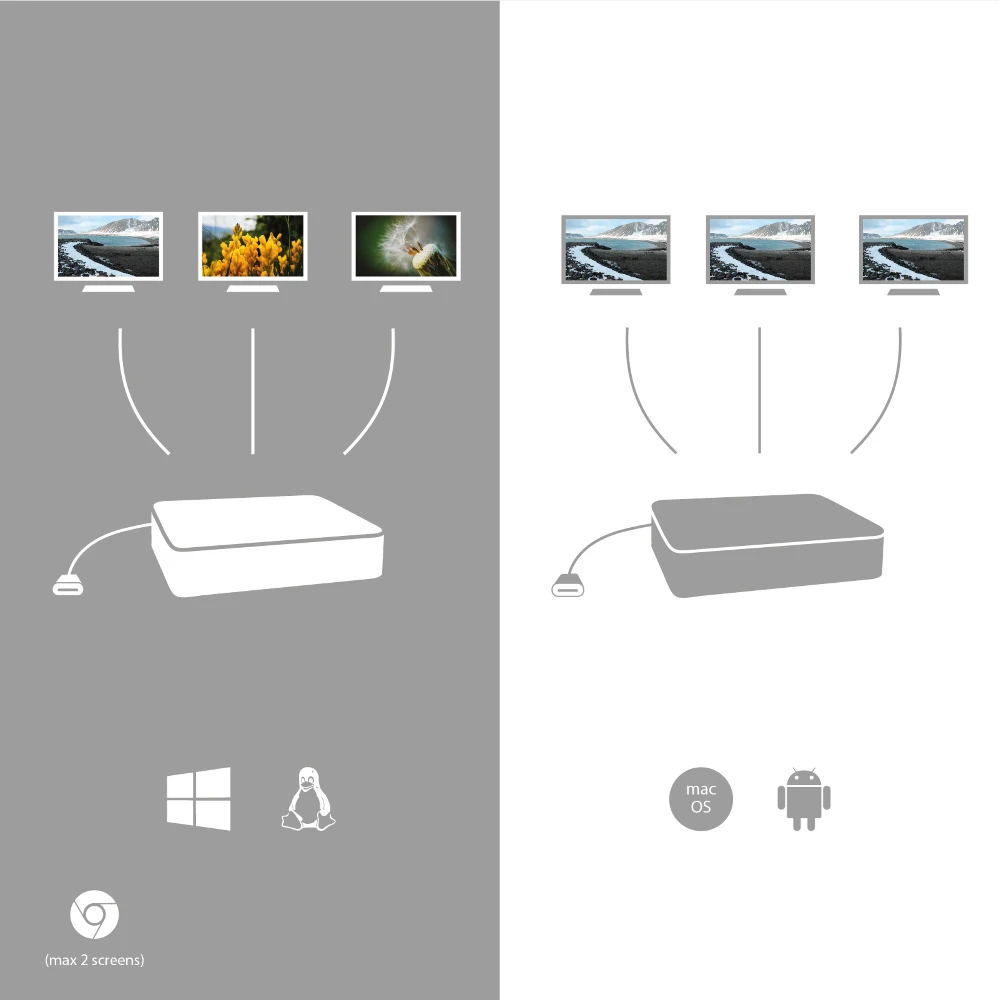 Note: macOS does not support Multi Stream Transport (MST) technology, meaning that when connected to a device running macOS, all connected monitors will display the same image.