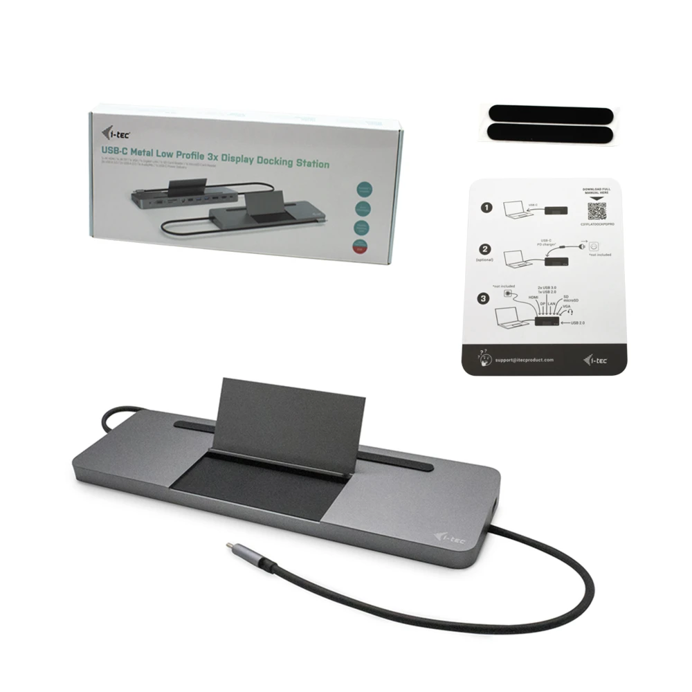 i-tec Metal USB-C Ergonomic 4K 3x Display Docking Station + Power Delivery 85 W. Connectivity technology: Wired, Host interface: USB 3.2 Gen 1 (3.1 Gen 1) Type-C, USB Power Delivery up to: 85 W. Ethernet LAN data rates: 10,100,1000 Mbit/s. Product colour: Grey, Compatible memory cards: SD, Housing material: Metal. Power cable length: 0.6 m. Other operating systems supported: Android