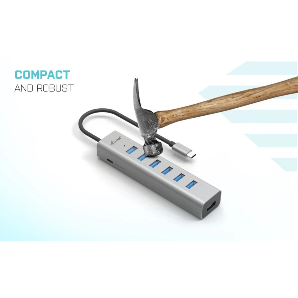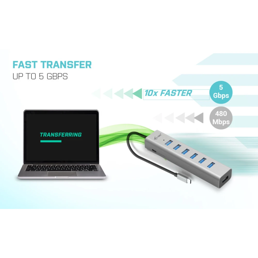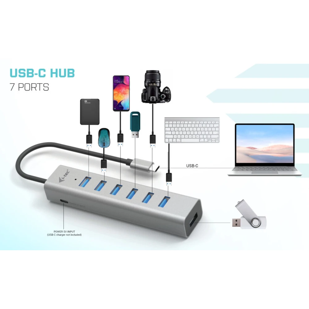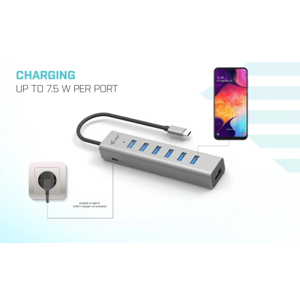 i-tec USB-C Charging Metal HUB 7 Port. Host interface: USB 3.2 Gen 1 (3.1 Gen 1) Type-C, Hub interfaces: USB 3.2 Gen 1 (3.1 Gen 1) Type-A. Data transfer rate: 5000 Mbit/s, Product colour: Grey, Cable length: 0.3 m. Other operating systems supported: Android. Width: 157 mm, Depth: 30 mm, Height: 21 mm. Package width: 180 mm, Package depth: 100 mm, Package height: 27 mm