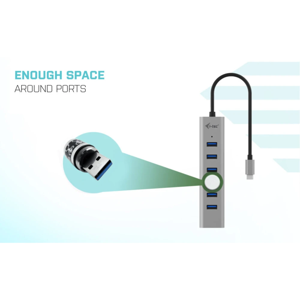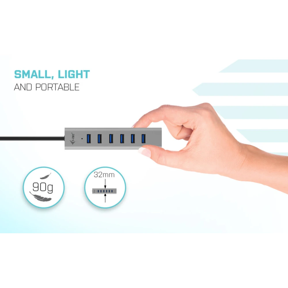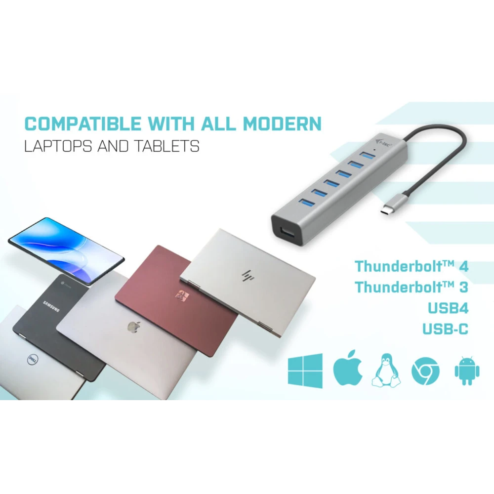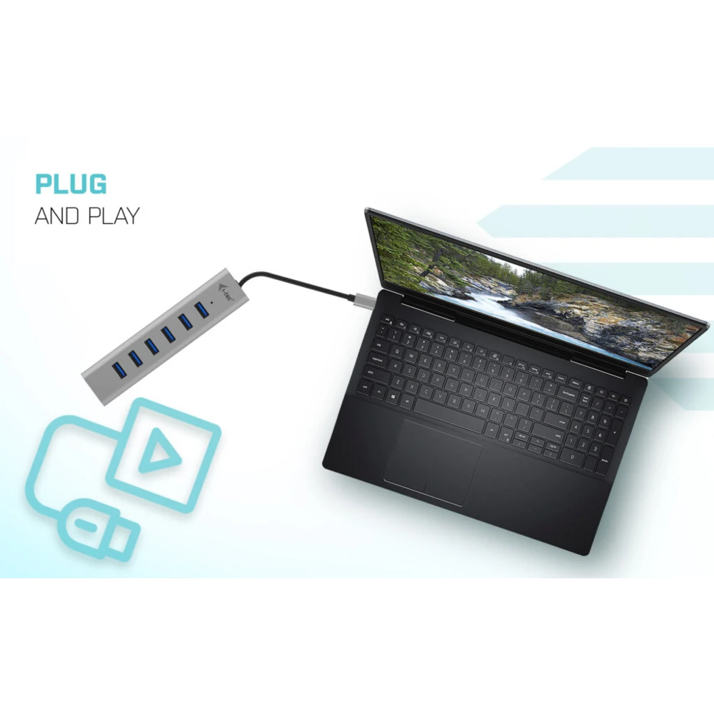 i-tec USB-C Charging Metal HUB 7 Port. Host interface: USB 3.2 Gen 1 (3.1 Gen 1) Type-C, Hub interfaces: USB 3.2 Gen 1 (3.1 Gen 1) Type-A. Data transfer rate: 5000 Mbit/s, Product colour: Grey, Cable length: 0.3 m. Other operating systems supported: Android. Width: 157 mm, Depth: 30 mm, Height: 21 mm. Package width: 180 mm, Package depth: 100 mm, Package height: 27 mm