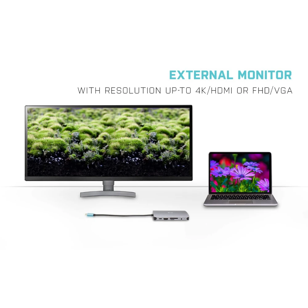 Small metal USB-C docking station capable of easily connecting an external monitor or projector via an HDMI or VGA port. Simply connect your laptop or tablet (no need to install drivers) and reap the benefits of quick USB data transfer, connection to the internet via a LAN port, and the ability to connect your headset. And of course, the docking station can also power your laptop with up to 100 W, meaning you will be able to charge all laptops and tablets that support charging via USB-C (USB-C Power Delivery).