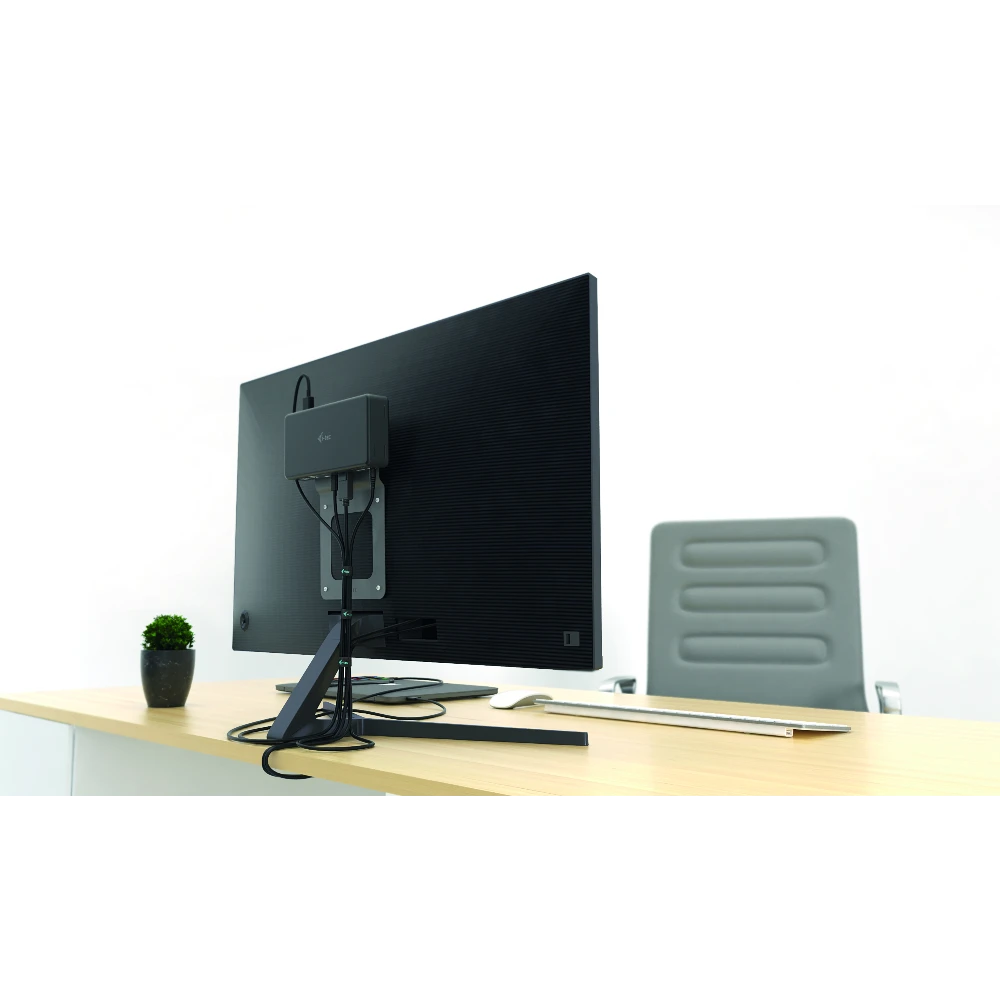 An important element of a modern working environment is a comfortable, clean and efficient desktop. Through intelligent use of the VESA standard, you can now keep your desk better organised and tidier than before. By mounting the docking station on the rear of the monitor and managing the associated cables, we improve the working environment and comfort for the user, and enhance protection against theft.