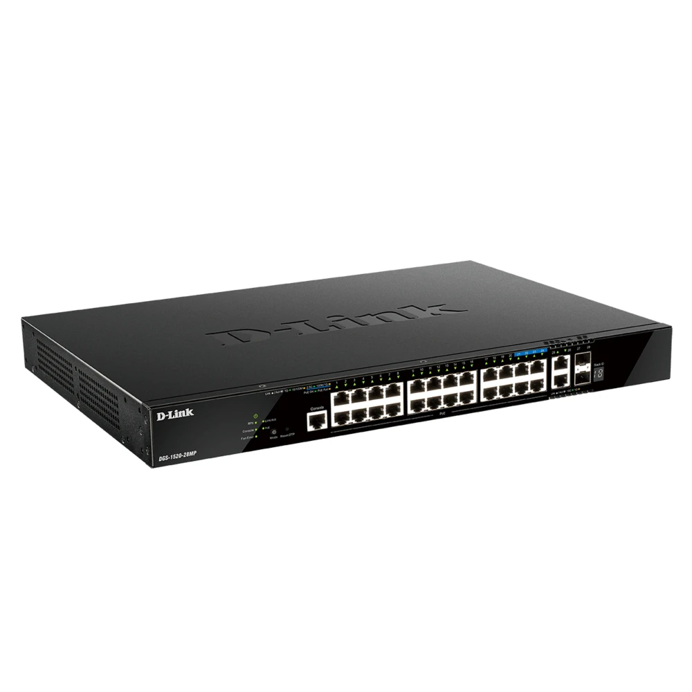 D-Link DGS-1520-28MP. Switch type: Managed, Switch layer: L3. Basic switching RJ-45 Ethernet ports type: Gigabit Ethernet (10/100/1000), Basic switching RJ-45 Ethernet ports quantity: 20. MAC address table: 16384 entries, Switching capacity: 140 Gbit/s. Power over Ethernet (PoE). Rack mounting, Form factor: 1U