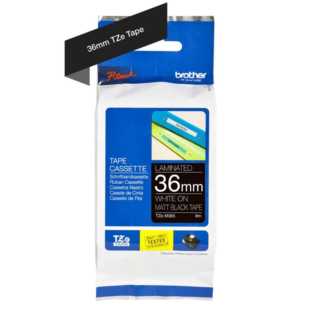 Labelling Tape Cassette ? Matt Laminated White On Black, 36mm wide Brother TZe-M365. Compatibility: PT-P900W PT-D800W PT-P950NW P-touch CUBE Pro PT-3600 PT-9600 PT-9700PC PT-9800PCN, Printing colours: White, Product colour: Black. Ribbon width: 3.6 cm, Ribbon length: 8 m. Package type: Blister, Quantity per pack: 1 pc(s) This genuine Brother TZe-M365 labelling tape cassette is guaranteed to provide you with crisp, sharp and easily readable labels that last.