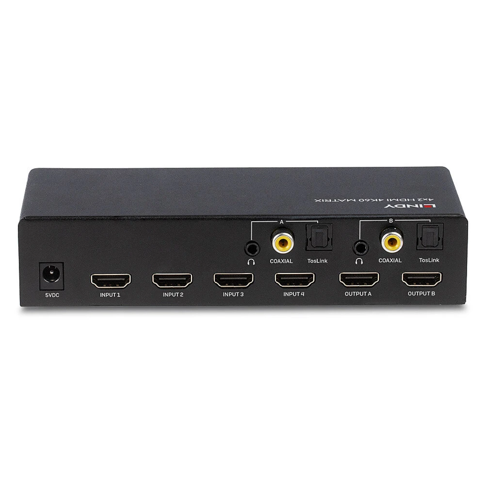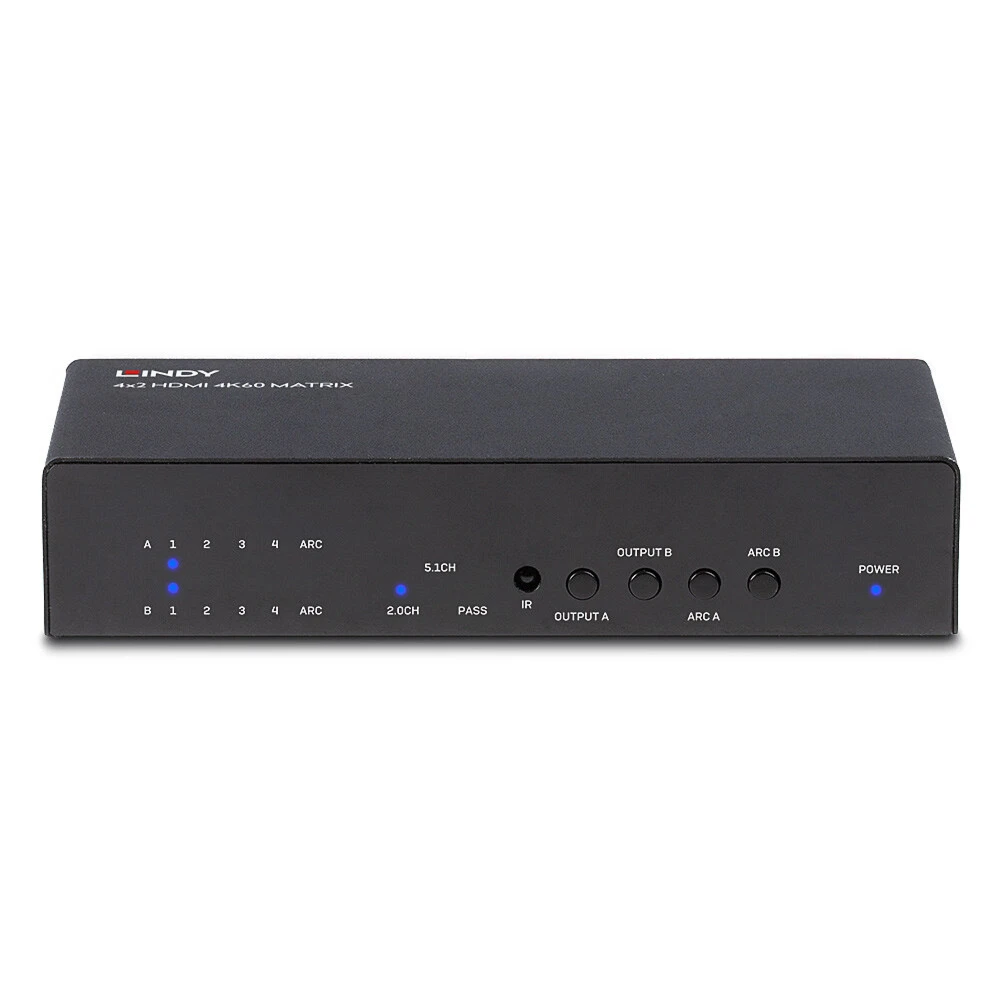 The Lindy 4x2 HDMI 4K60 Matrix Switch is a high performance solution for distributing content from multiple source devices to two displays.