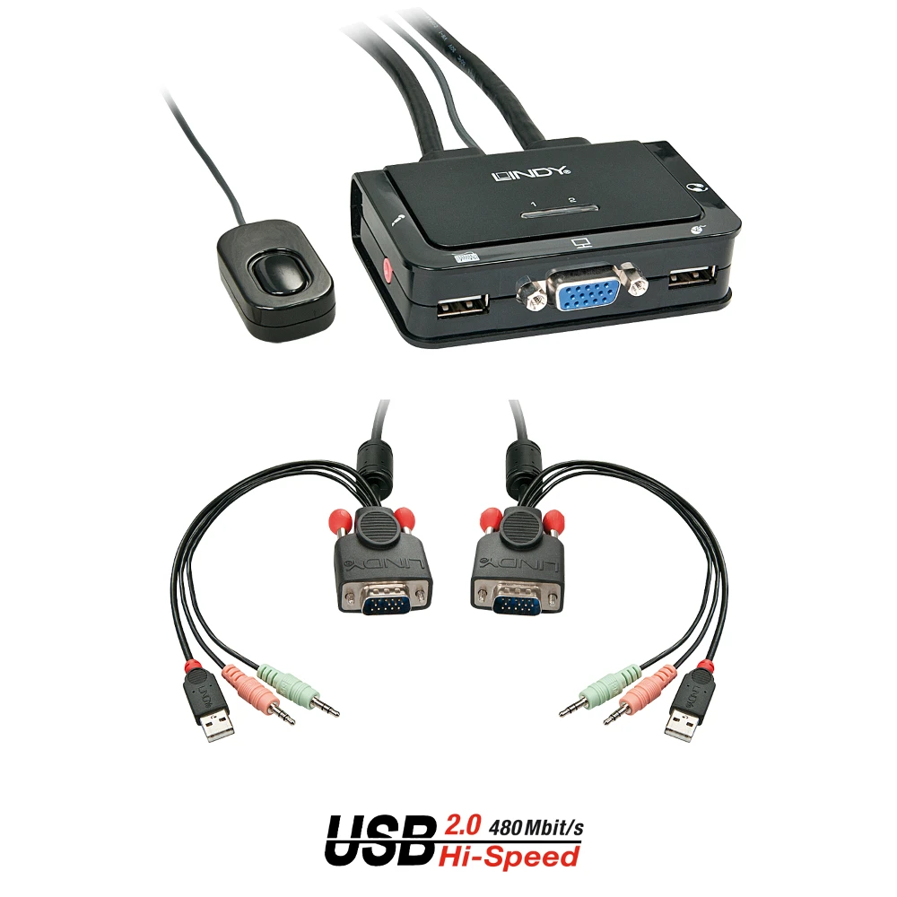 The Lindy 2 Port VGA, USB 2.0 & Audio KVM Switch is a compact solution for providing access and control over two VGA equipped PCs from a single keyboard, mouse and monitor. With integrated cables, this switch can be easily connected directly to the system, with no need for purchasing additional cables and saving time on the installation.