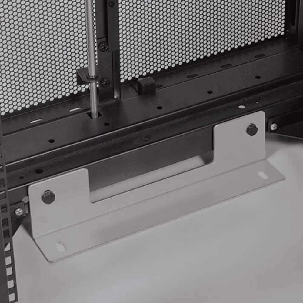 Included stabilizing brackets are used for shipment and can be reattached at the bottom of the enclosure frame on the inside or outside of the rack.
