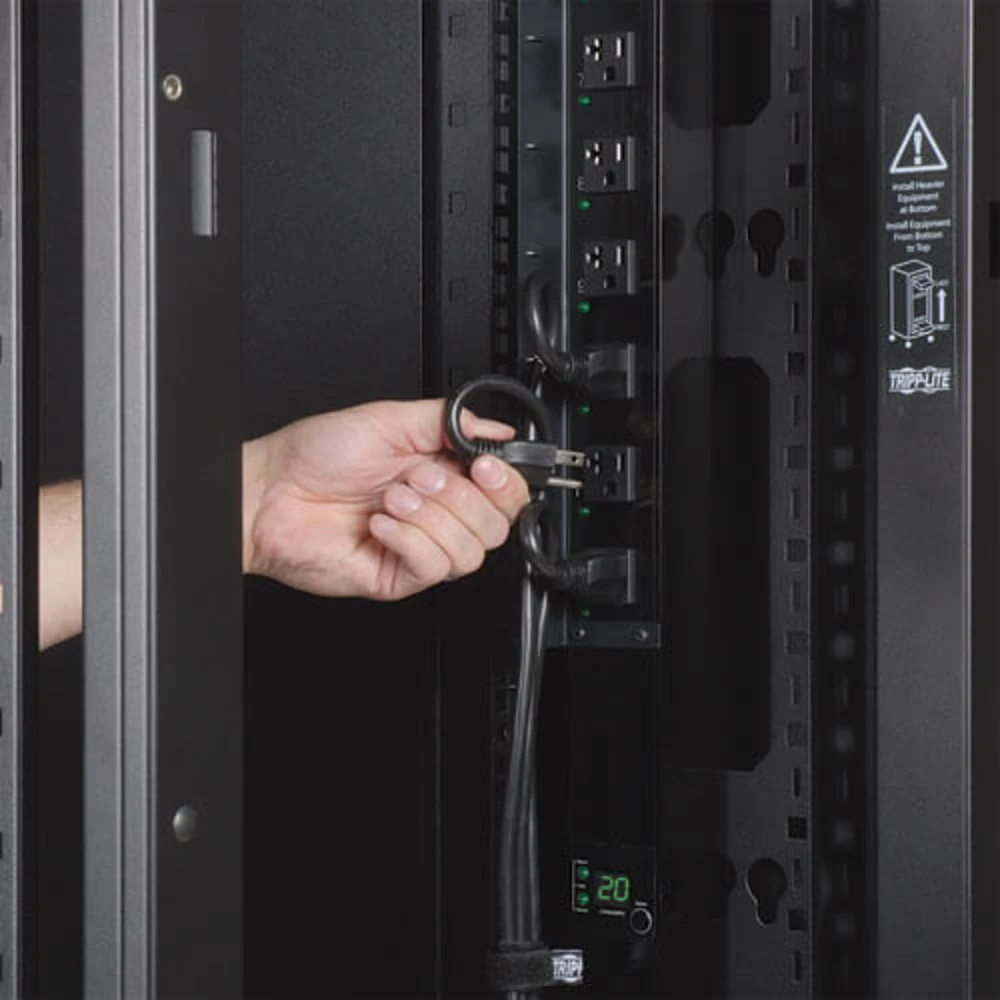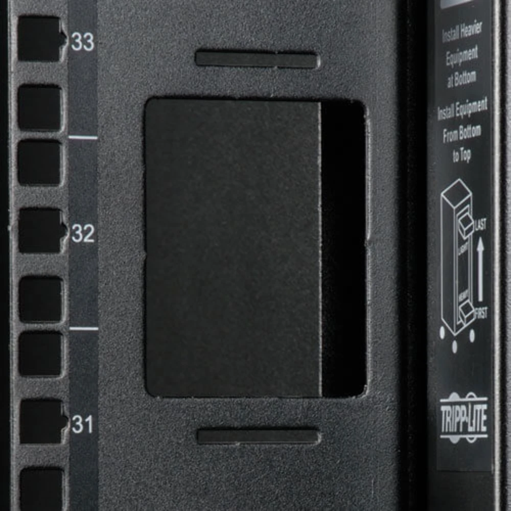 Two of the adjustable vertical mounting rails support toolless button-mount 0U installation of up to four compatible PDUs and cable managers. This feature makes it easier to route cabling to rack equipment and reduces cord clutter.