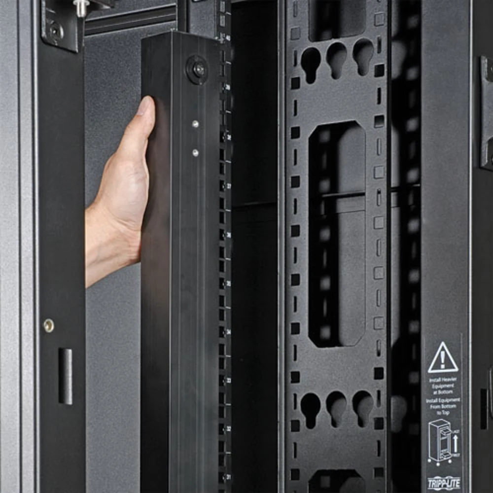 Toolless accessory mounting rails (2 rails per enclosure) include slots for quick installation of compatible PDUs and vertical cable managers. Mounting slots are arranged in an industry-standard pattern compatible with a wide variety of accessories. Each rail can accommodate two vertical PDUs or cable managers side-by-side (four items per enclosure).