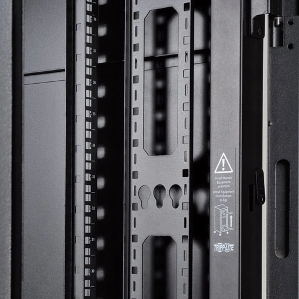The SR48UBWD houses 3,000 pounds (1360.8 kilograms) of standard 19-inch rack equipment in 48U. Its front and rear pairs of vertical rails have square mounting holes that are adjustable in quarter-inch increments from four to 37 inches. Adjustment is quick and an easy-view depth index ensures consistent rail placement without requiring time-consuming measurements. Each rack space within the enclosure is numbered for ready reference.