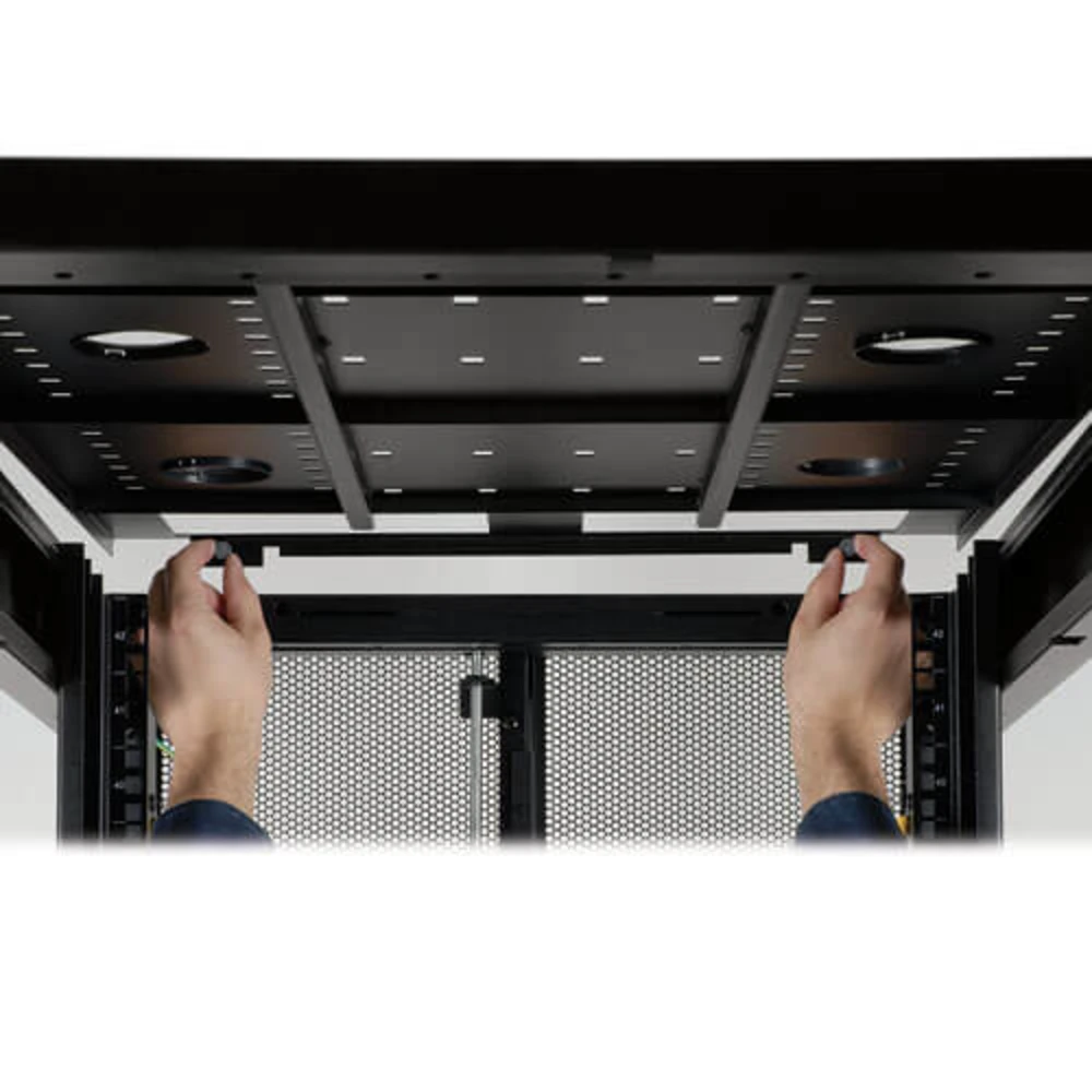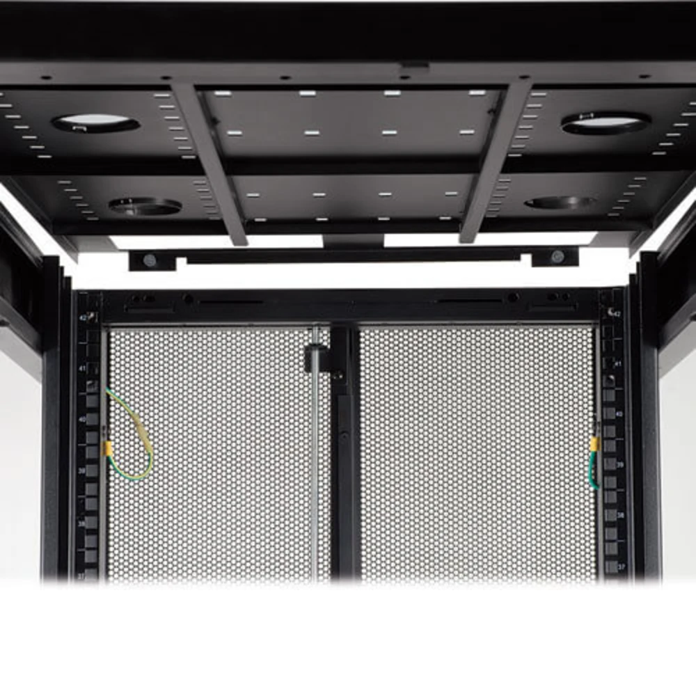 Massive front to rear ventilation capacity. 65+% open space in door perforation pattern meets or exceeds server manufacturer requirements.