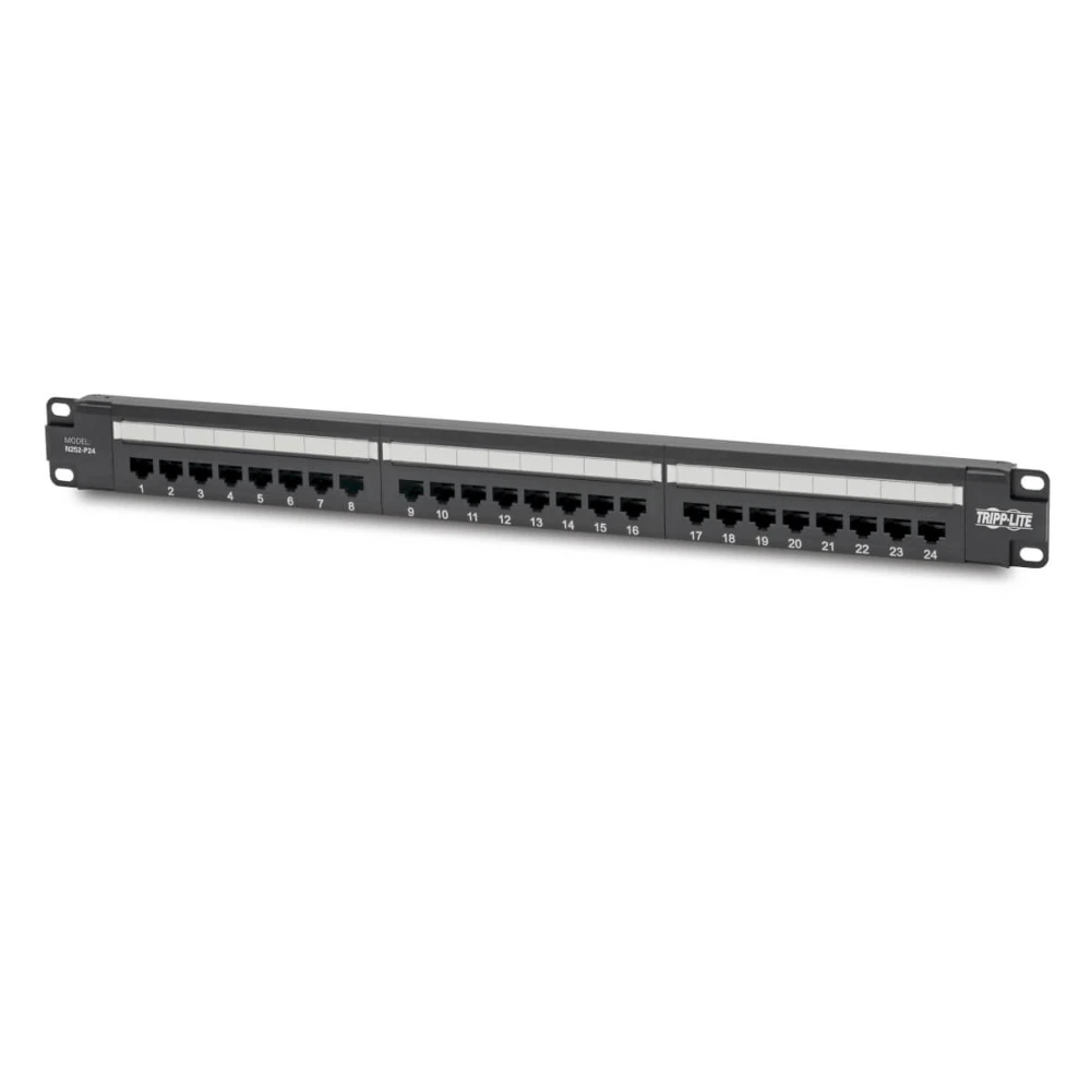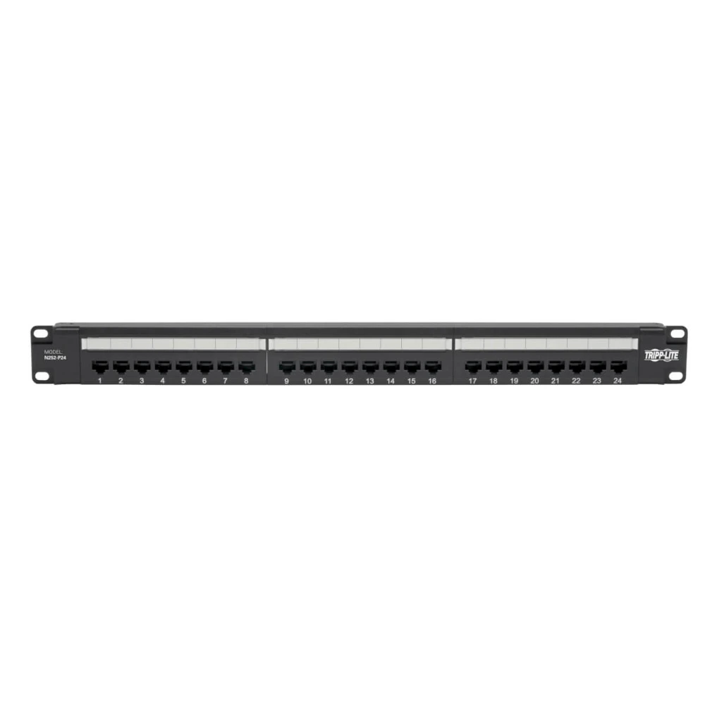 Tripp Lite N252-P24 Cat6 24-Port Patch Panel - PoE+ Compliant, 110/Krone, 568A/B, RJ45 Ethernet, 1U Rack-Mount, TAA. Connector(s): RJ-45, Cable types supported: Cat5, Cat5e, Cat6. Product colour: Black, Mounting: Rack mounting, Rack capacity: 1U. Input voltage: 110 V. Width: 479.8 mm, Height: 43.9 mm, Depth: 111.3 mm. Package width: 502.9 mm, Package depth: 73.7 mm, Package height: 71.1 mm