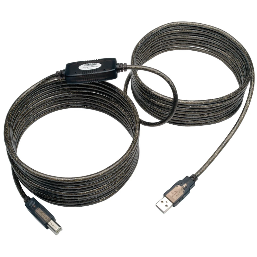 USB 2.0 A to B Active Repeater Cable (M/M), 25 ft. (7.62 m) Tripp Lite U042-025 USB 2.0 A to B Active Repeater Cable (M/M), 25 ft. (7.62 m). Cable length: 8 m, Connector 1: USB A, Connector 2: USB B, USB version: USB 2.0, Connector gender: Male/Male, Maximum data transfer rate: 480 Mbit/s, Product colour: Black This High-Speed USB 2.0 Active A/B cable overcomes the five-meter USB distance limitation with an active repeater in the middle of the cable. USB printers and other devices can be located up to 25 feet (7.6 meters) away from the computer in a single non-daisy-chainable run with no need for extension cables. Full 480 Mbps speed is maintained along the entire length of the cable. Backward compatible to USB 1.1. Plug-and-play, Windows and macOS compatible. The U042-025 provides up to 150mA of power to the connected device. If your device requires more than 150mA of power, it will either need to have its own power supply (not included) or to be plugged into a powered USB 2.0 hub (such as U222-007-R) that is connected to the U042-025.
