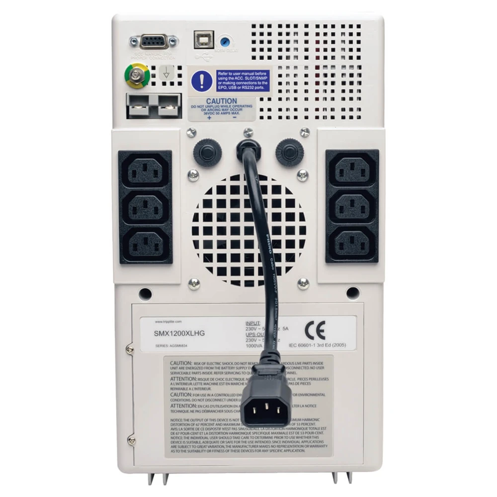 SmartPro 230V 1kVA 750W Medical-Grade Line-Interactive Tower UPS with 6 Outlets, Full Isolation, Expandable Runtime Tripp Lite SMX1200XLHG SmartPro 230V 1kVA 750W Medical-Grade Line-Interactive Tower UPS with 6 Outlets, Full Isolation, Expandable Runtime. Output power capacity: 1 kVA, Output power: 750 W, Input operation voltage (min): 230 V. AC outlet types: C13 coupler, Power plug: C14 coupler, AC outlets quantity: 6 AC outlet(s). Typical backup time at full load: 11 min, Typical backup time at half load: 27.5 min, Battery recharge time: 4.5 h. Form factor: Tower, Product colour: White, Certification: CE, IEC 60601-1. Width: 190.5 mm, Depth: 229.9 mm, Height: 322.6 mm The SMX1200XLHG medical-grade UPS system provides dependable battery backup and is fully compliant with UL 60601-1 regulations when plugged into a hospital-grade outlet, making it ideal for use in patient care vicinities. The 1kVA/750W capacity provides up to 27.5 minutes of runtime for a half load or 11 minutes for a full load, so you can work through short power failures and perform an orderly system shutdown in a prolonged blackout.