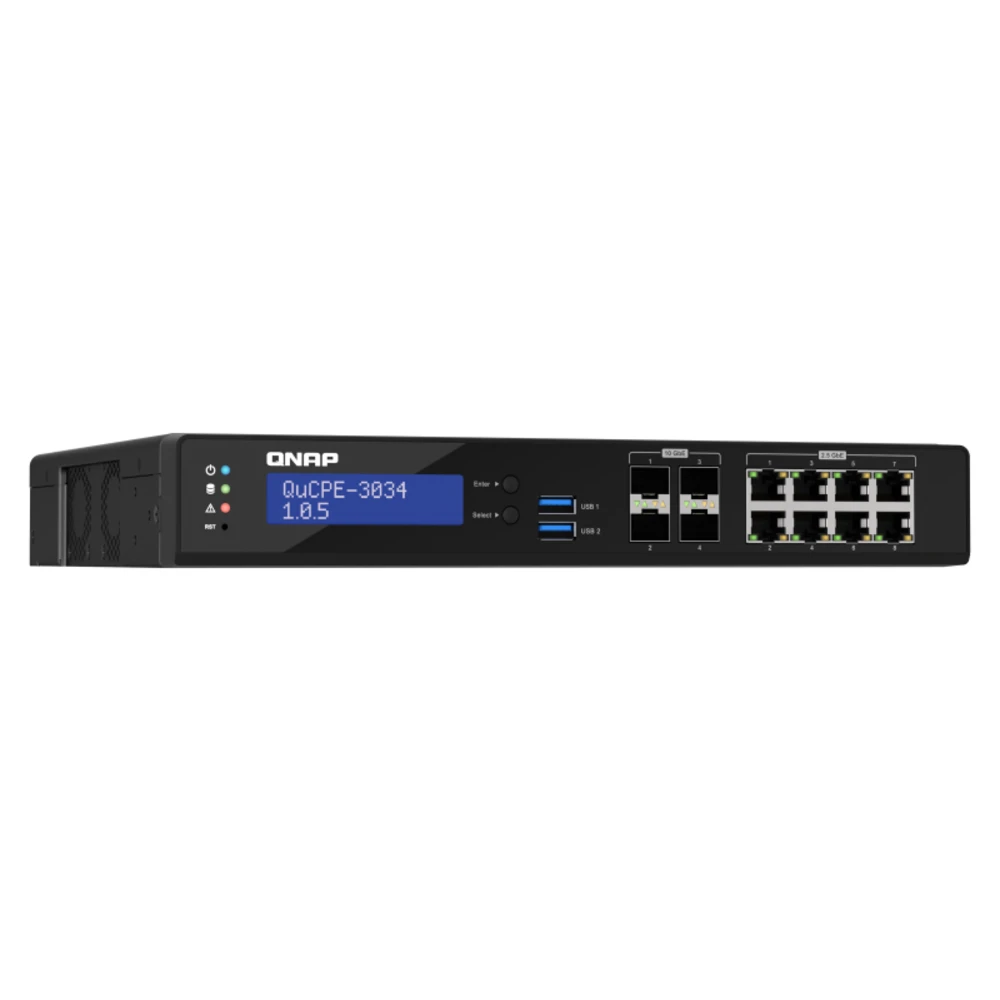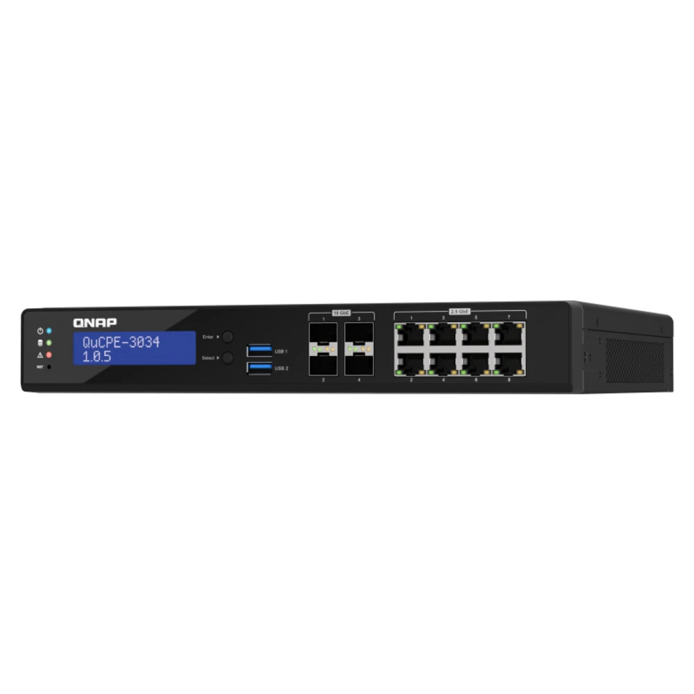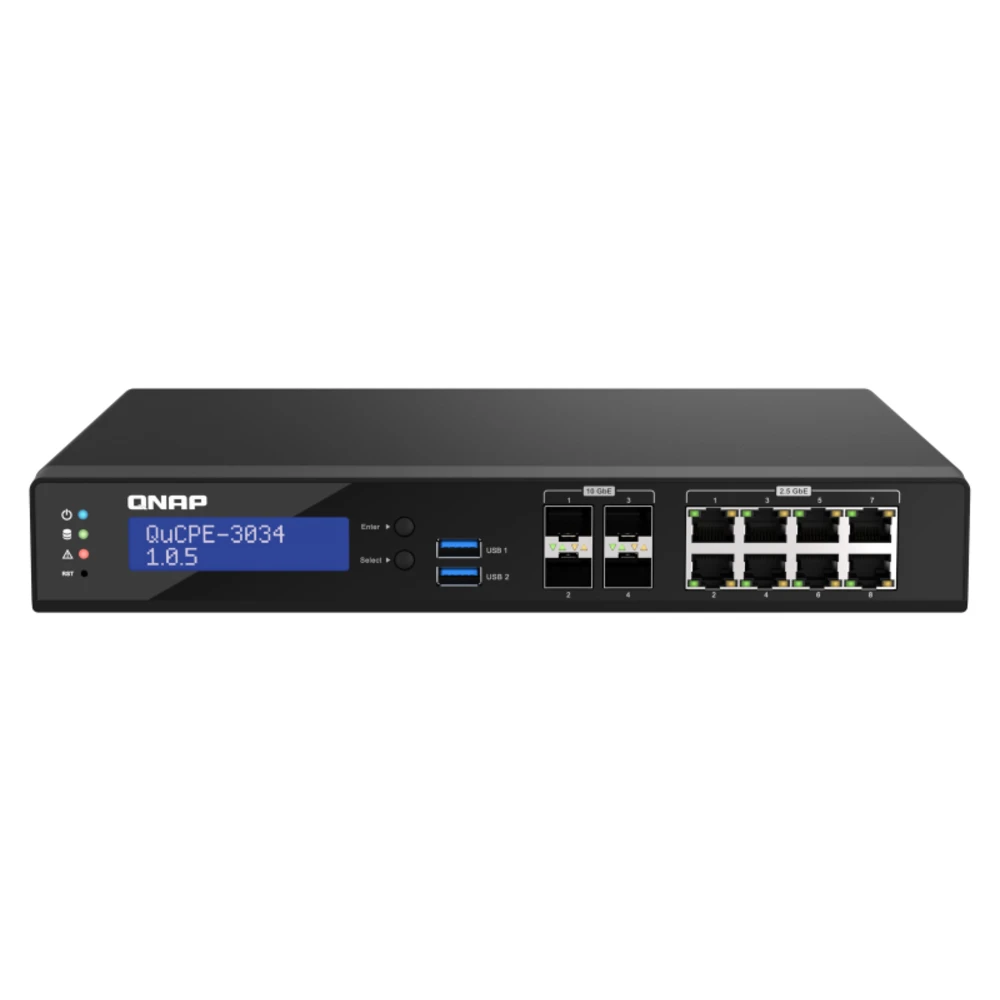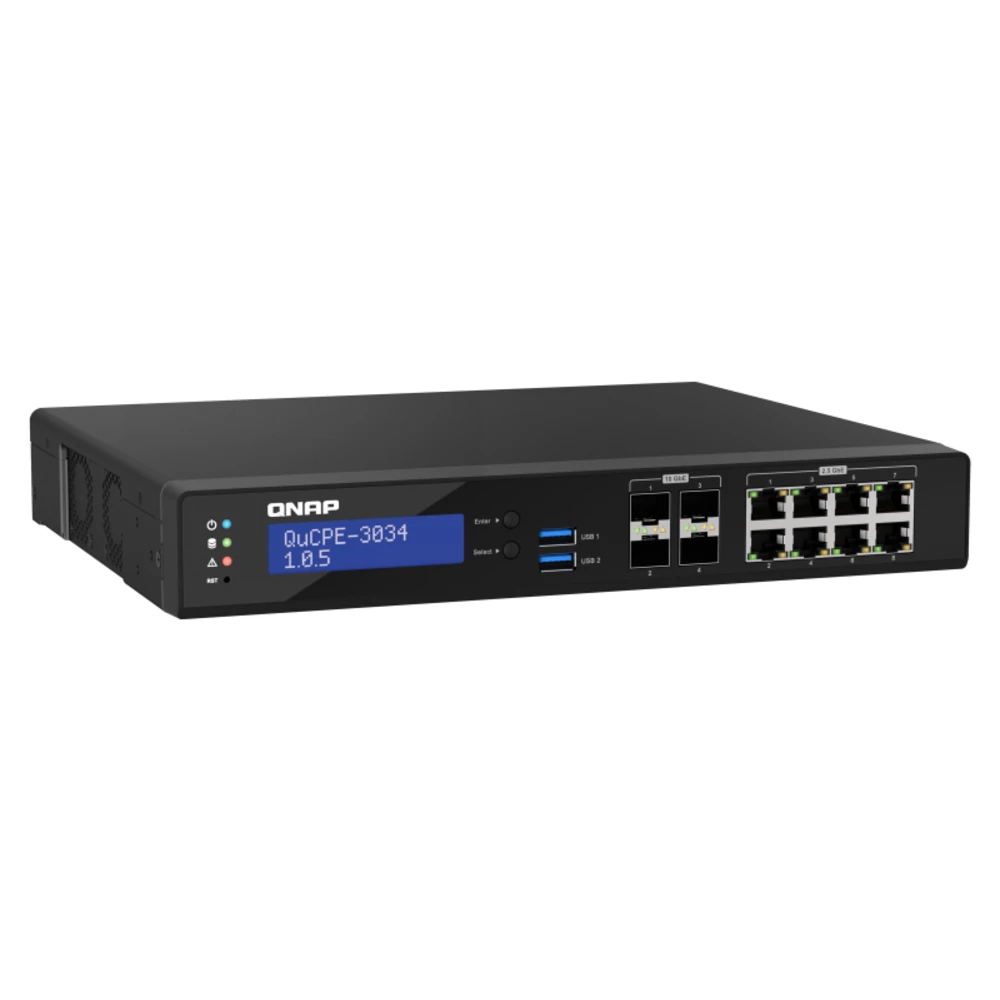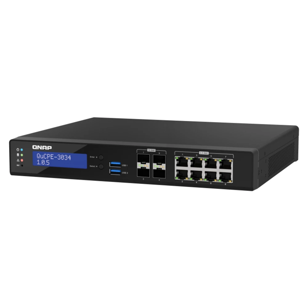 QNAP QUCPE-3034. Processor manufacturer: Intel, Processor family: Intel Atom?, Processor model: C3758R. Internal memory type: DDR4, Internal memory: 16 GB, Memory clock speed: 2400 MHz. Supported storage drive types: SSD, Supported storage drive interfaces: M.2. Ethernet LAN data rates: 10,100,1000,2500 Mbit/s. Fiber optic connector: SFP+, Console port: RJ-45
