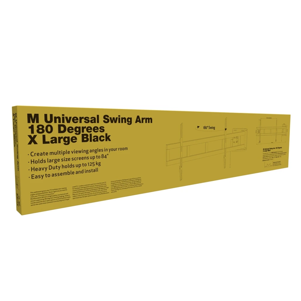 The M Universal Swing Arm 180 Degrees X Large uses a strong metal construction, yet light weight and very tight to your wall only 54mm?s. Placed right it extends up to 180 degrees and turn your TV in the exact opposite position it was starting from, amazing and for many users very needed and useful.