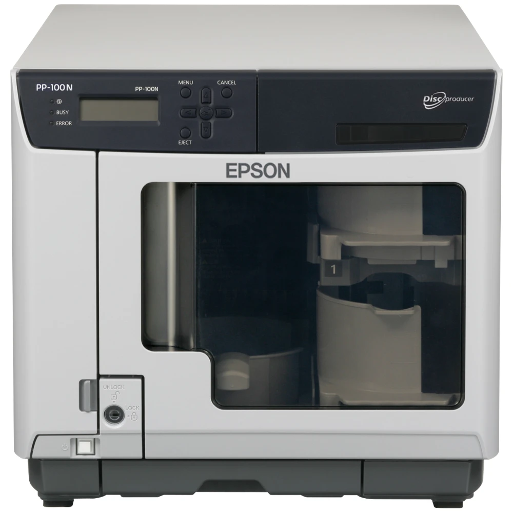 The Epson Discproducer PP-100N is the ideal solution if you need to burn and print CD/DVD series on a regular basis. Networkable and optimised for working in groups, it can receive up to five jobs simultaneously from different users, and will publish them conveniently and reliably.