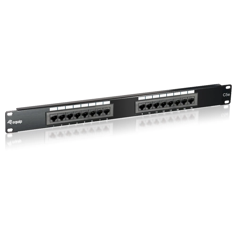 16-Port Cat.5e Unshielded Patch Panel Equip 16-Port Cat.5e Unshielded Patch Panel, Black. Connector(s): RJ-45, Connector contacts plating: Gold, Cable types supported: Cat5e. Product colour: Black, Mounting: Rack mounting, Rack capacity: 1U. Certification: ANSI/TIA/EIA 568. Width: 44 mm, Height: 483 mm, Depth: 29 mm. Package width: 50 mm, Package depth: 43 mm, Package height: 505 mm The equip® Patch Panel is a 19" 1U network distribution unit integrating cable management system for better routing and strain relief requirements, suitable for both LSA and 110 standards. Featuring 16 x RJ45 ports, this patch panel is recommended to connect with equip® patch cords and cabling accessories to achieve outstanding performance. Moreover, each port is marked with port number for recognition.