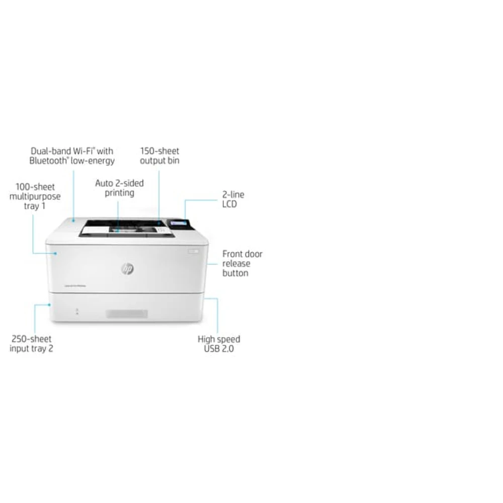 LaserJet Pro M404dw HP LaserJet Pro M404dw, Print, Wireless. Print technology: Laser. Number of print cartridges: 1, Maximum duty cycle: 80000 pages per month. Maximum resolution: 1200 x 1200 DPI. Maximum ISO A-series paper size: A4. Print speed (black, normal quality, A4/US Letter): 38 ppm, Duplex printing. Display: LCD. Network ready, Wi-Fi. Product colour: White The HP LaserJet Pro M404 printer – focus your time where it’s most effective-growing your business Winning in business means working smarter. The HP LaserJet Pro M404 printer is designed to let you focus your time where it’s most effective-helping to grow your business and staying ahead of the competition.