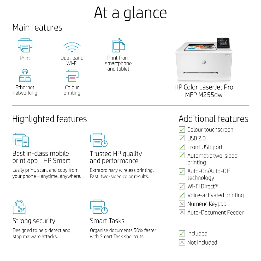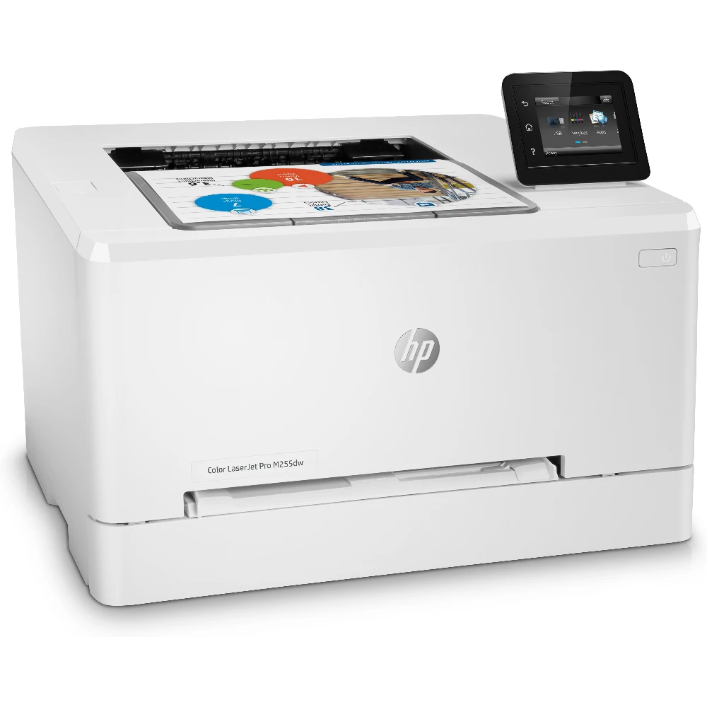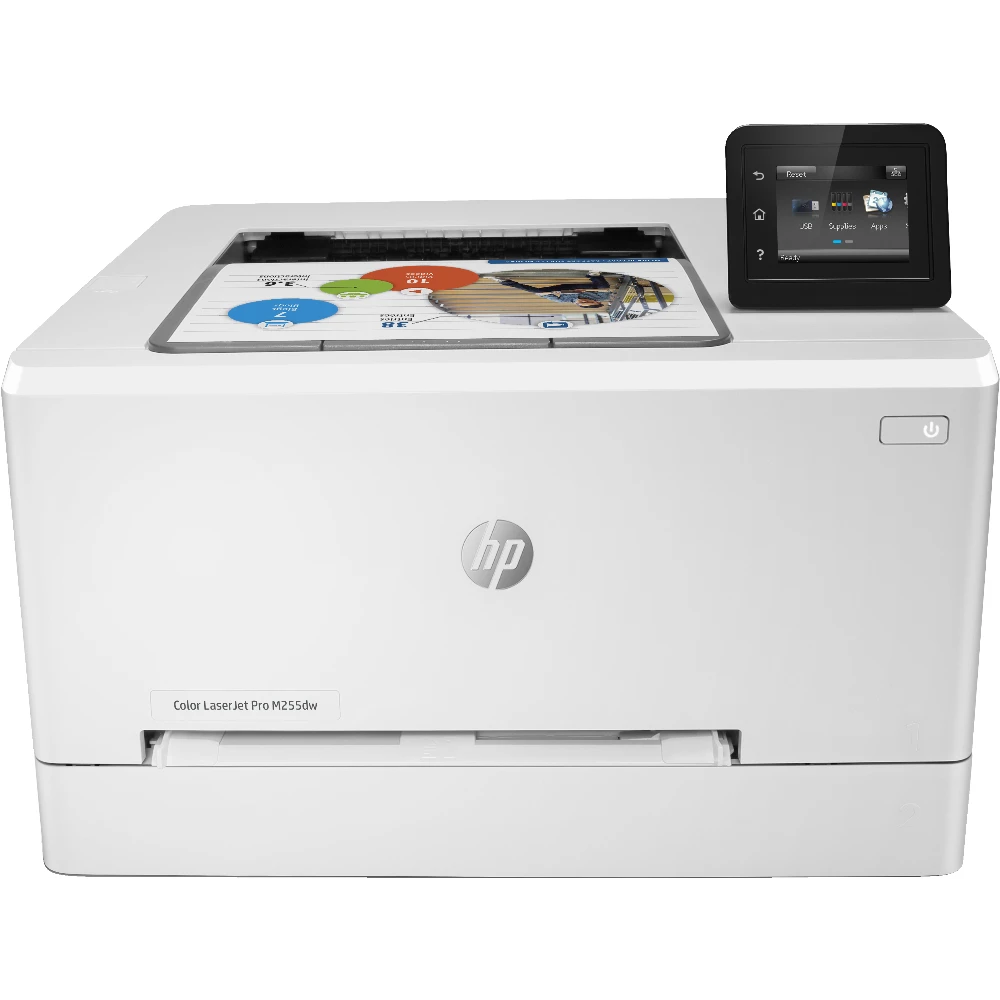 Color LaserJet Pro M255dw HP Color LaserJet Pro M255dw, Print, Two-sided printing; Energy Efficient; Strong Security; Dualband Wi-Fi. Print technology: Laser, Colour. Number of print cartridges: 4, Maximum duty cycle: 40000 pages per month. Maximum resolution: 600 x 600 DPI. Maximum ISO A-series paper size: A4. Print speed (black, normal quality, A4/US Letter): 21 ppm, Duplex printing. Network ready, Wi-Fi. Product colour: White Get high-quality colour, wireless two-sided printing[1] and smart mobility and security solutions.[2] Impress with colour and increase efficiency. Get high-quality colour and fast two-sided print speeds. Save time with Smart Task shortcuts in HP Smart app, and print and scan from your phone.[2] Get seamless connections and strong security solutions.