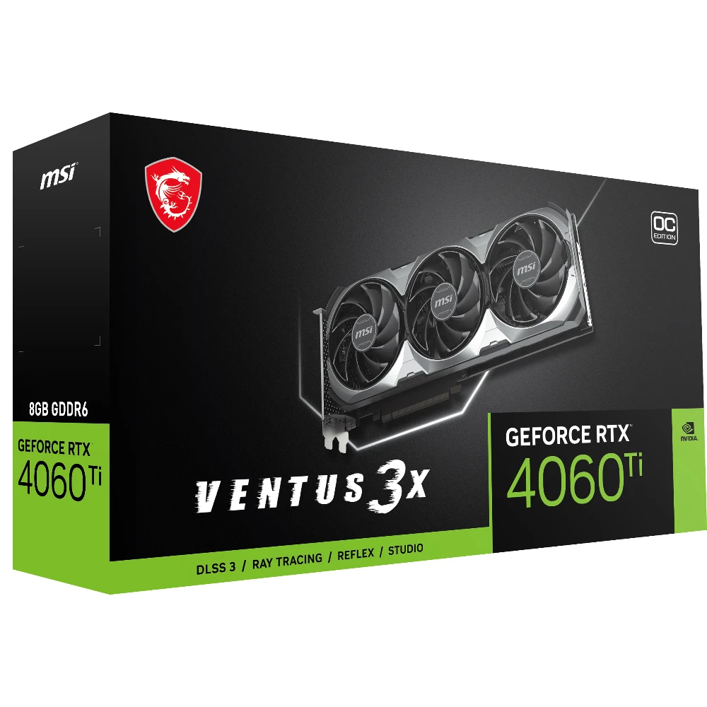 MSI GeForce RTX 4060 Ti VENTUS 3X 8G OC. Graphics processor family: NVIDIA, Graphics processor: GeForce RTX 4060 Ti. Discrete graphics card memory: 8 GB, Graphics card memory type: GDDR6, Memory bus: 128 bit. Maximum resolution: 7680 x 4320 pixels. DirectX version: 12.0, OpenGL version: 4.6. Interface type: PCI Express 4.0. Cooling type: Active, Number of fans: 3 fan(s)
