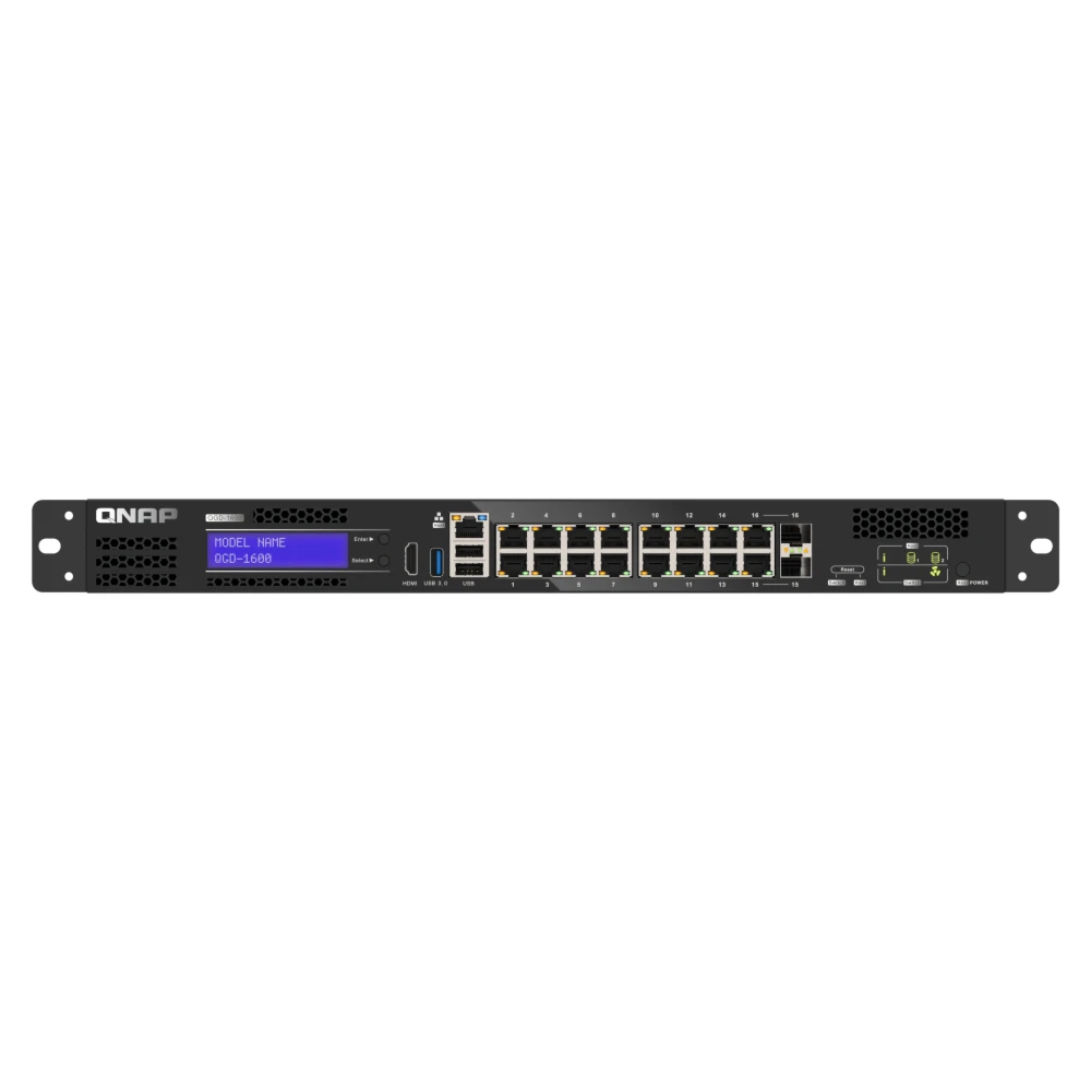 Intel Celeron J4115 (2x 1.8GHz), 8GB SODIMM DDR4, 4GB Flash, LCD, 2x 2.5" SATA, 14x RJ-45, 2x SFP/RJ45, 100-240 VAC, 47.2 x 436.2 x 326.2 mm QNAP QGD-1600. Switch type: Managed. Basic switching RJ-45 Ethernet ports type: Gigabit Ethernet (10/100/1000), Basic switching RJ-45 Ethernet ports quantity: 16, USB 2.0 ports quantity: 2. Full duplex. MAC address table: 8000 entries, Switching capacity: 32 Gbit/s. Networking standards: IEEE 802.3ab, IEEE 802.1p, IEEE 802.3u, IEEE 802.3x, IEEE 802.3z, IEEE 802.1Q. Rack mounting, Form factor: 1U QGD-1600 Switch allows installation of ADRA NDR cybersecurity software, which can detect suspicious packets across all the connected end devices on your LAN to protect against targeted ransomware at an early stage. It?s an affordable wide-ranging LAN security solution.