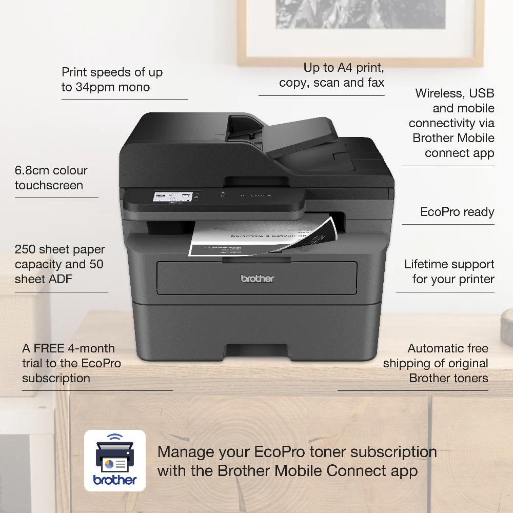 MFC-L2860DWE All-in-One A4 Mono Laser Printer Brother MFC-L2860DWE EcoPro Ready All-in-One Mono Laser Printer. Print technology: Laser, Printing: Mono printing, Maximum resolution: 1200 x 1200 DPI. Copying: Mono copying, Maximum copy resolution: 600 x 600 DPI. Scanning: Colour scanning, Optical scanning resolution: 1200 x 1200 DPI. Faxing: Mono faxing. Duplex functions: Print. Maximum ISO A-series paper size: A4. Wi-Fi. Direct printing. Product colour: Black Our EcoPro ink & toner subscription makes printing hassle-free. You’ll never have to worry about having enough toner again, as your EcoPro printer automatically detects when your printer is running low and orders the required toner directly to your door, so you are always fully stocked and ready to print. Subscribe to a better way to print.