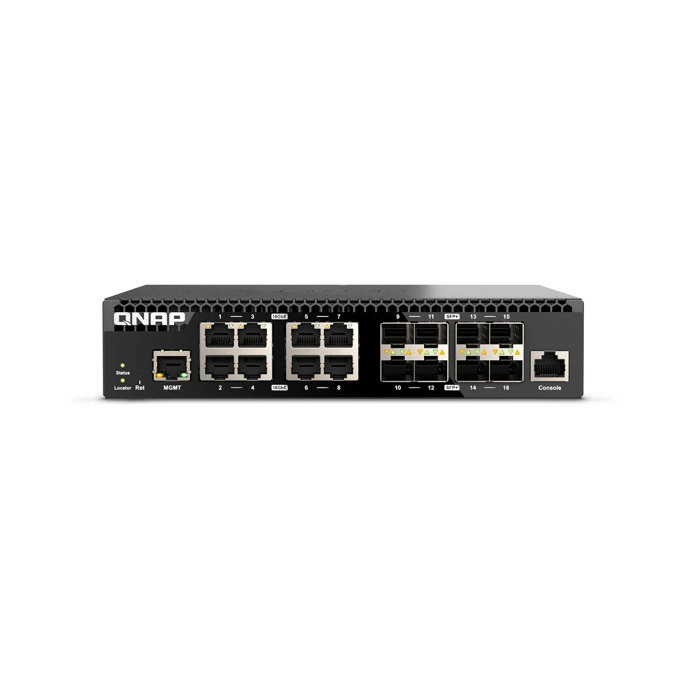 The QSW-M3216R-8S8T provides eight 10GbE SFP+ ports and eight 10GbE RJ45 ports for connecting various devices and enabling high-speed networks. With SFP+ interfaces, Direct Attach Copper (DAC) cables can be used for connecting directly to SFP+ devices. You can also use RJ45 ports to connect 10GBASE-T/NBASE-T™ devices through RJ45 Category 6 (or better) cabling.