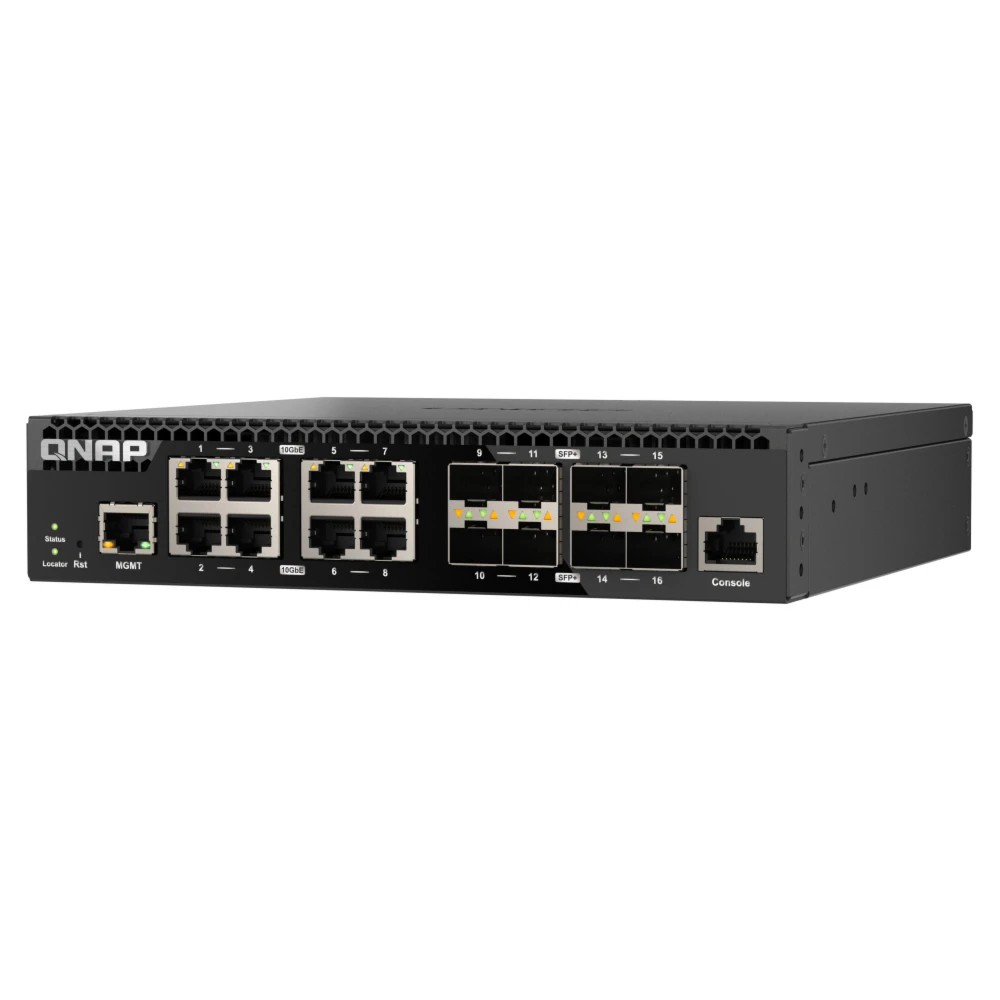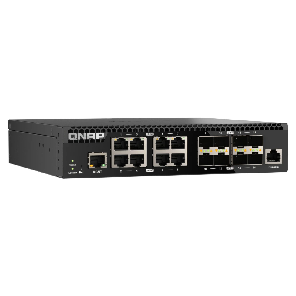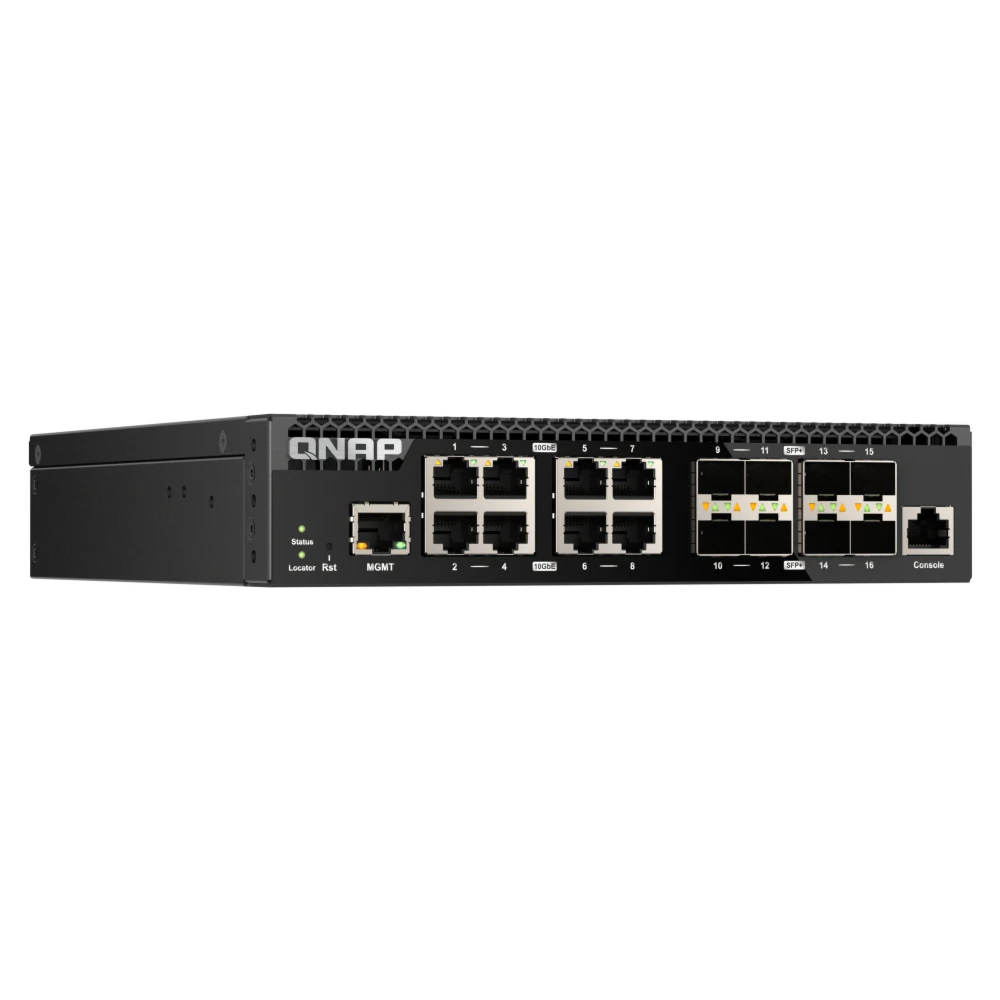QNAP QSW-M3216R-8S8T. Switch type: Managed, Switch layer: L2/L3. Basic switching RJ-45 Ethernet ports type: 10G Ethernet (100/1000/10000), Basic switching RJ-45 Ethernet ports quantity: 8, Installed SFP+ modules quantity: 8, Console port: RJ-45. MAC address table: 16000 entries, Switching capacity: 320 Gbit/s. Networking standards: IEEE 802.3, IEEE 802.3ab, IEEE 802.3ae, IEEE 802.3p, IEEE 802.3u, IEEE 802.3x, IEEE 802.3z. Rack mounting, Form factor: 1U