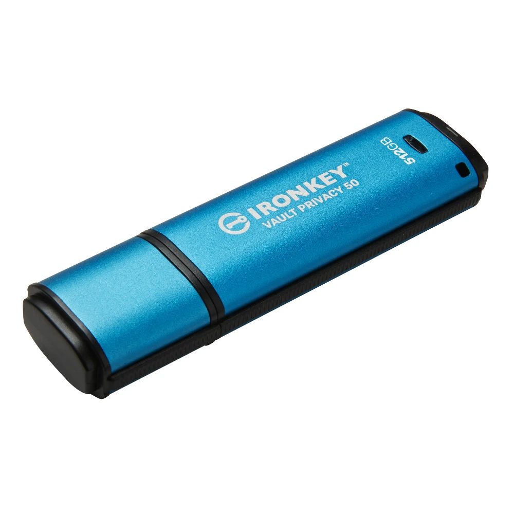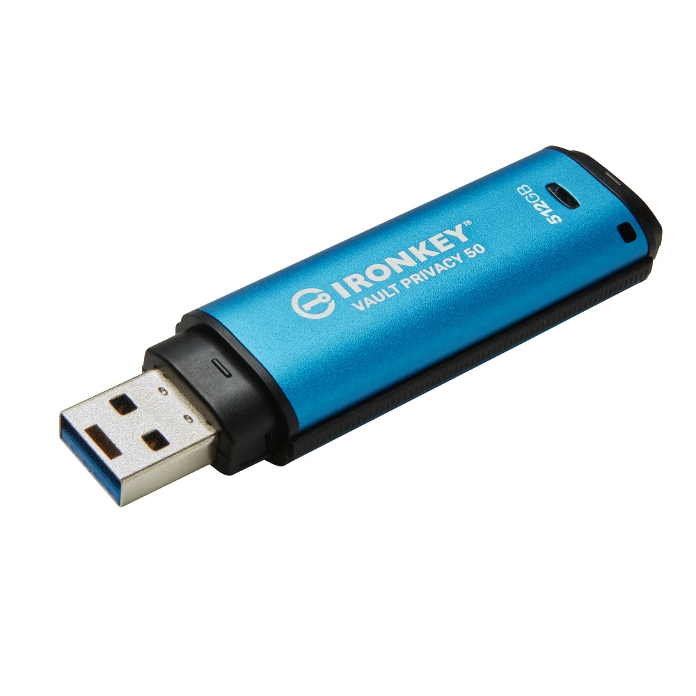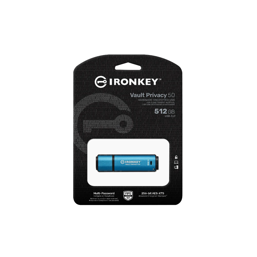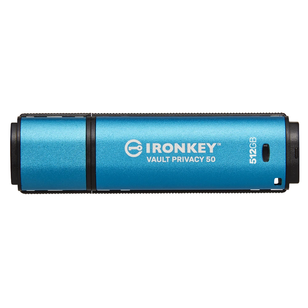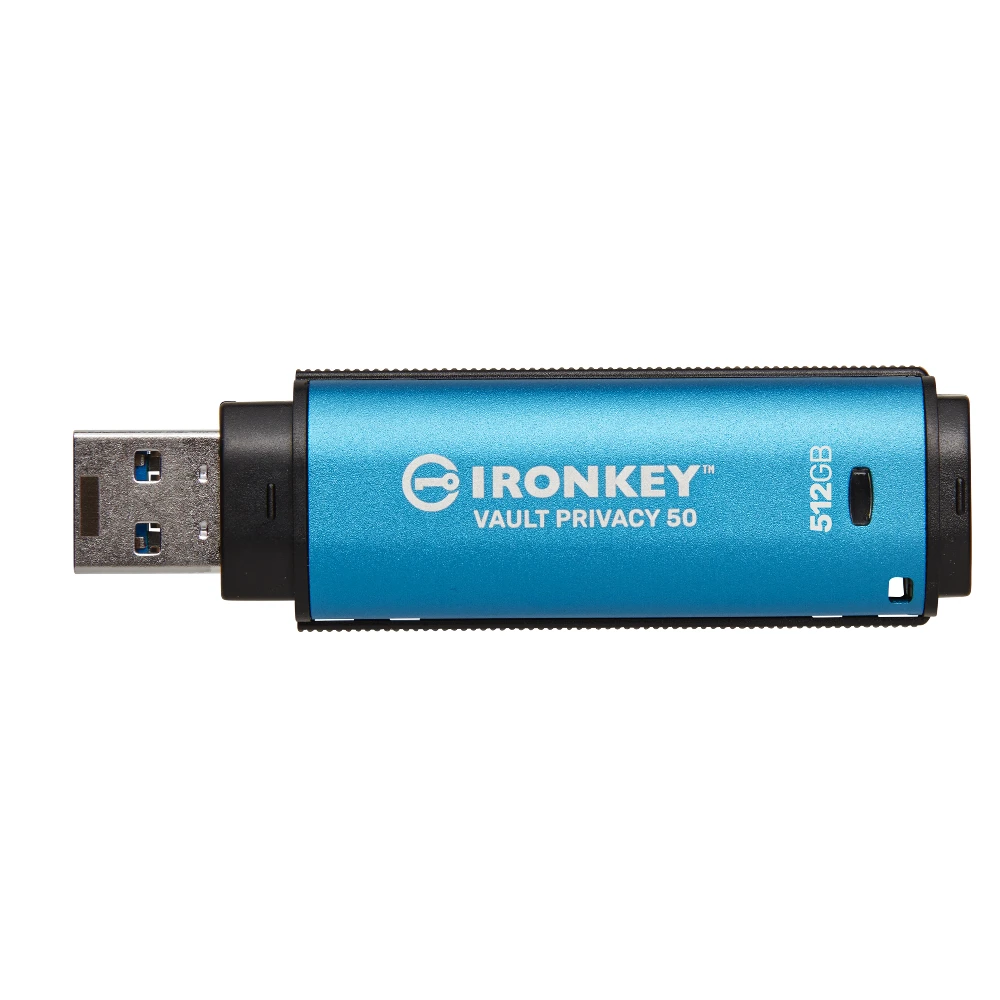 512GB IronKey Vault Privacy 50 AES-256 Encrypted, FIPS 197 Kingston Technology IronKey 512GB Vault Privacy 50 AES-256 Encrypted, FIPS 197. Capacity: 512 GB, Device interface: USB Type-A, USB version: 3.2 Gen 1 (3.1 Gen 1), Read speed: 310 MB/s, Write speed: 250 MB/s. Form factor: Cap. Password protection. Weight: 15 g. Product colour: Black, Blue Kingston IronKey™ Vault Privacy 50 series are premium USB Type-A and USB Type-C®* drives that provide enterprise-grade security with FIPS 197 certified AES 256-bit hardware-encryption in XTS mode, including safeguards against BadUSB with digitally-signed firmware and against brute force password attacks. VP50 has been penetration tested***** (pen tested) for enterprise-grade security. Because it provides encrypted storage under the user’s physical control, the VP50 series is superior to using the internet and Cloud services to safeguard data.