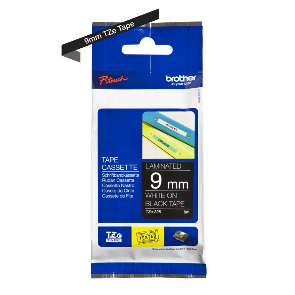 9 mm (W), 8 m, Laminated, White/Black Brother TZE-325. Tape type: TZ, Product colour: Black. Tape width: 9 mm, Tape length: 8 m, Width: 17 mm. Tape size: 9 mm Laminated tape white on clear 8m x 12mm