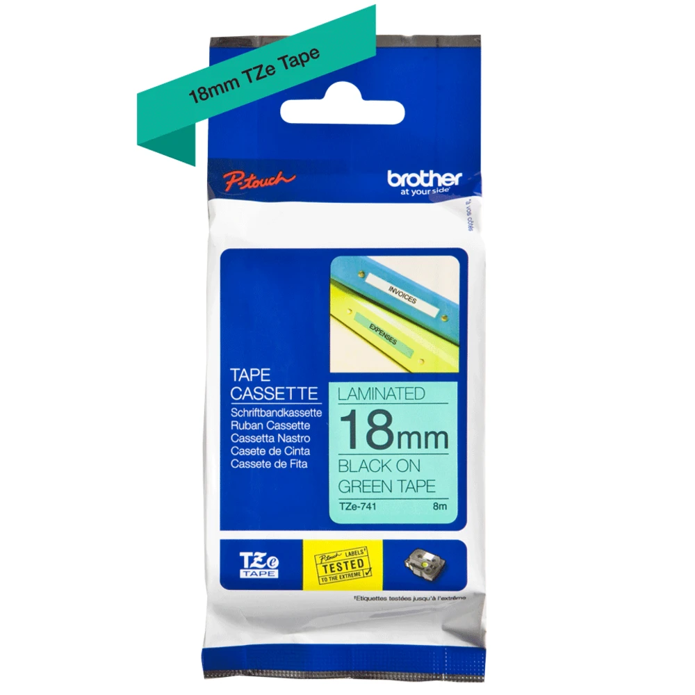 18mm black on green laminated Brother TZE-741. Label colour: Black on green, Tape type: TZ. Tape width: 1.8 cm, Tape length: 8 m, Width: 28 mm. Tape size: 1.8 cm For P-Touch series