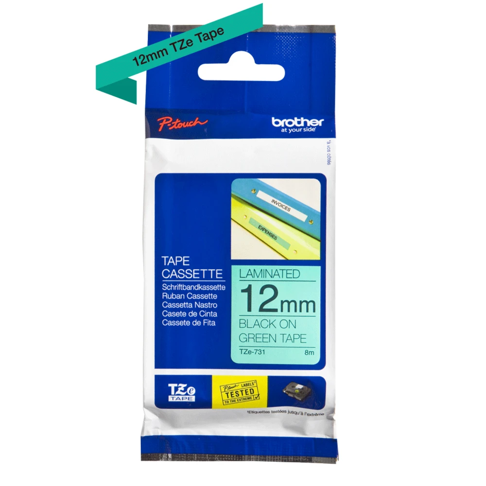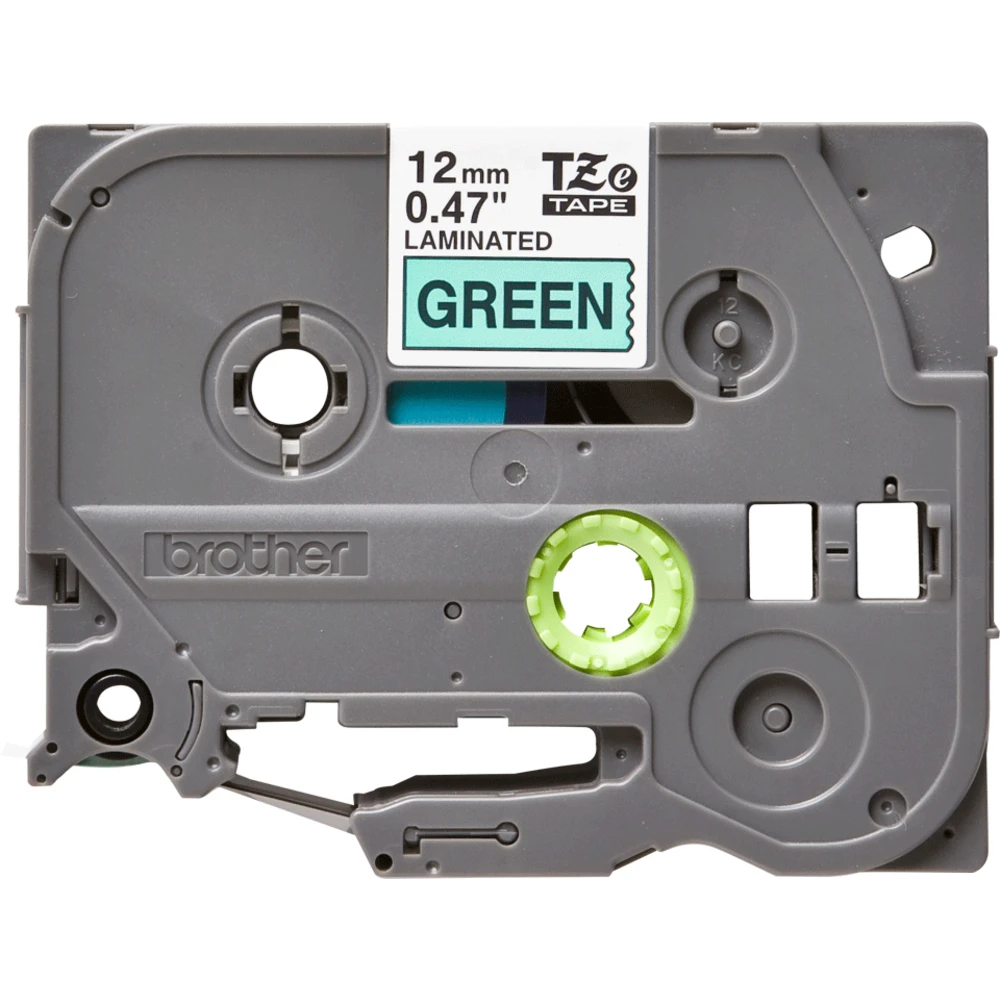 Brother Laminated tape 12mm. Label colour: Black on green, Tape type: TZe, Product colour: Green. Tape width: 1.2 cm, Tape length: 8 m, Width: 17 mm. Tape size: 1.2 cm