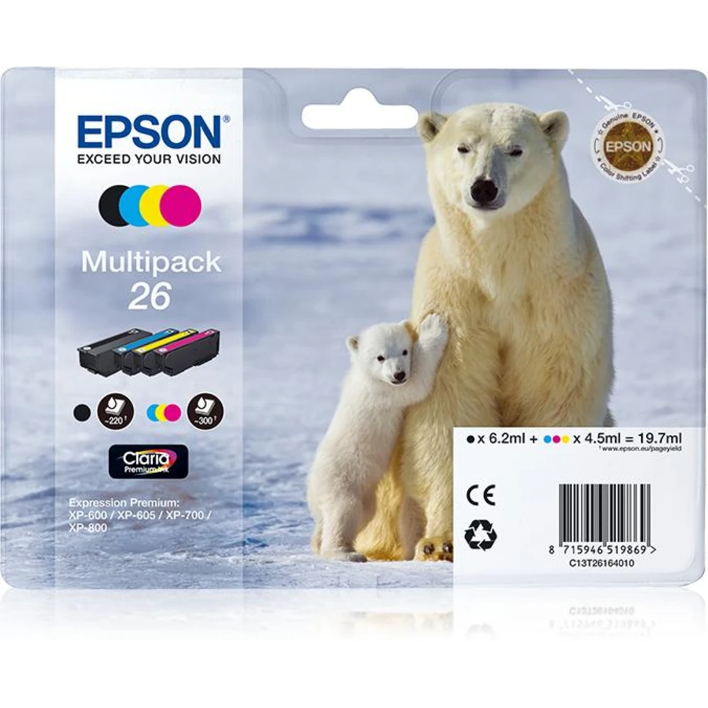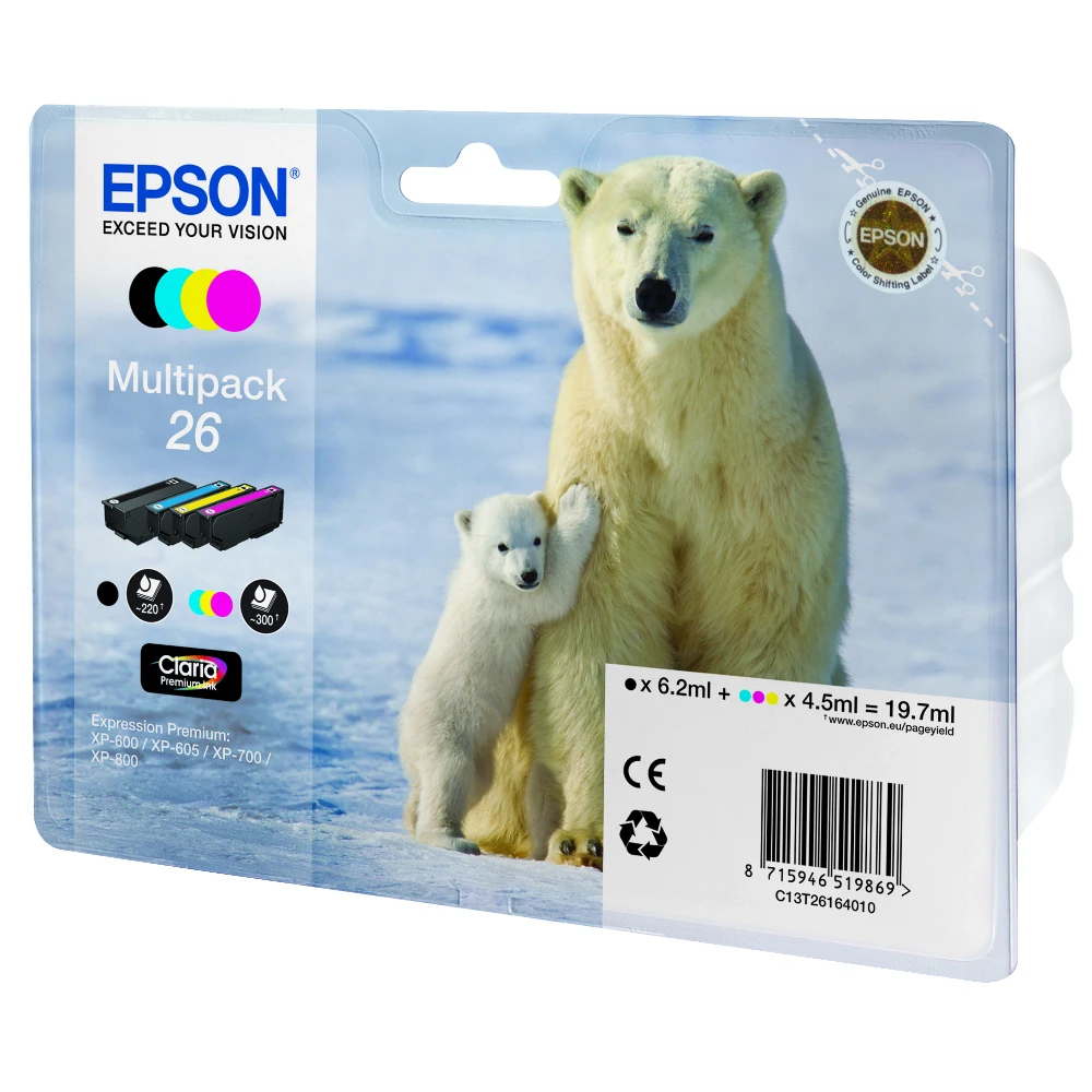 Epson Polar bear Multipack 4-colours 26 Claria Premium Ink. Colour ink type: Dye-based ink, Black ink type: Pigment-based ink, Black ink volume: 6.2 ml, Supply type: Multi pack, Colour ink volume: 4.5 ml, Printing colours: Black, Cyan, Magenta, Yellow, Quantity per pack: 1 pc(s)