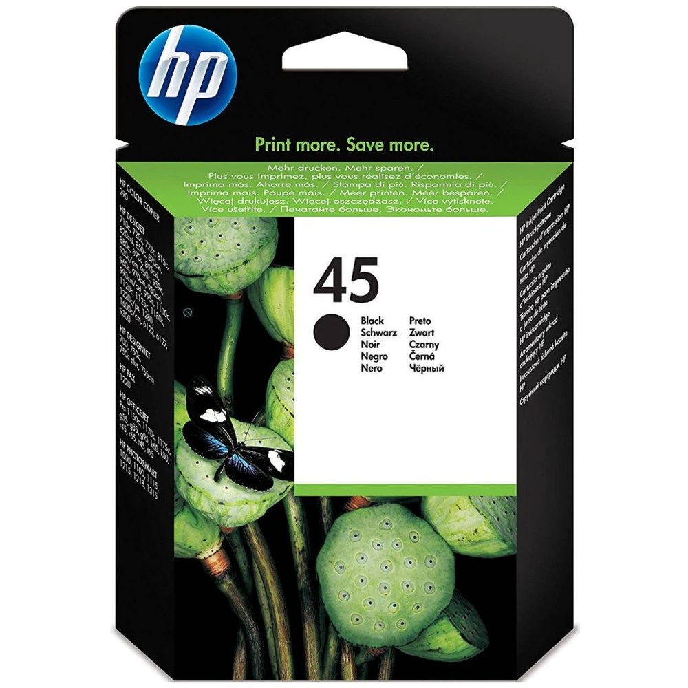 45 Large Black Original Ink Cartridge HP 45 Large Black Original Ink Cartridge. Colour ink type: Dye-based ink, Cartridge capacity: High (XL) Yield, Printing colours: Photo black, Quantity per pack: 1 pc(s) HP 45 Ink Cartridge, large black The HP 45 Black Inkjet Print Cartridge (42 ml) is the ideal choice for the frequent HP Deskjet, HP Photosmart and HP Officejet business and home user, who wants cost-effective, large-volume, clear, sharp output.