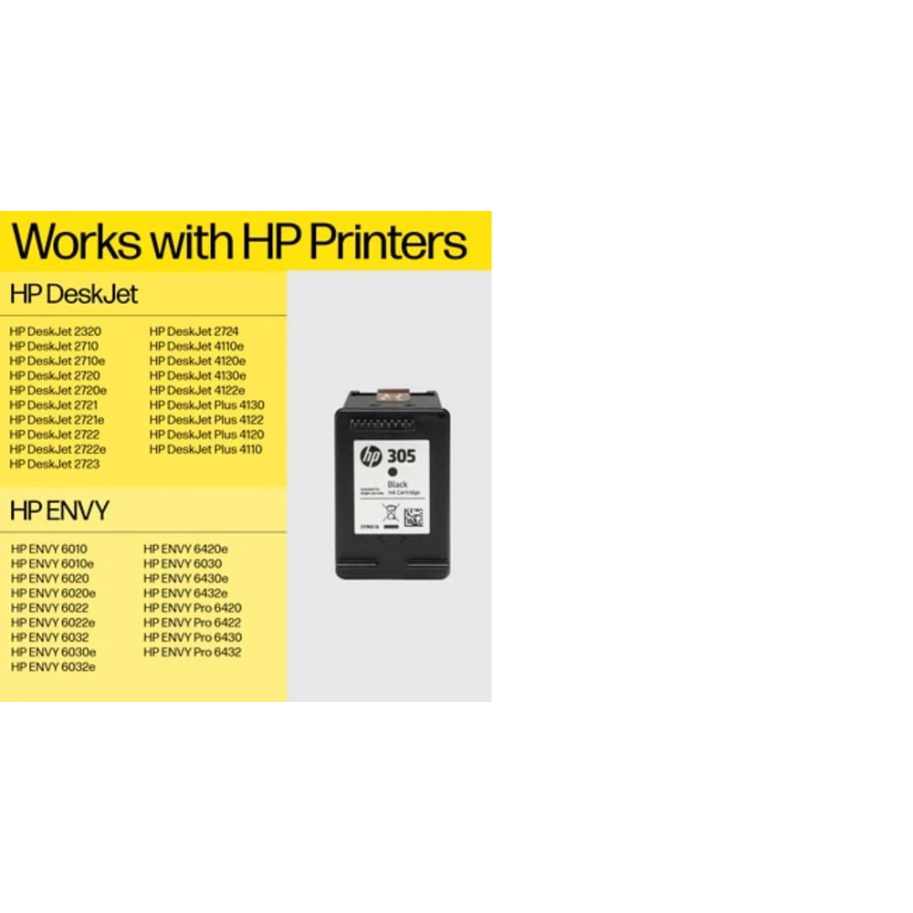 305XL High Yield Black Original Ink Cartridge HP 305XL High Yield Black Original Ink Cartridge. Cartridge capacity: High (XL) Yield, Black ink type: Pigment-based ink, Black ink volume: 4 ml, Printing colours: Black, Quantity per pack: 1 pc(s), Black ink page yield: 240 pages HP 305XL Ink Cartridge, black Ideal for households, micro-businesses, and small offices printing a variety of everyday colour documents and photos.