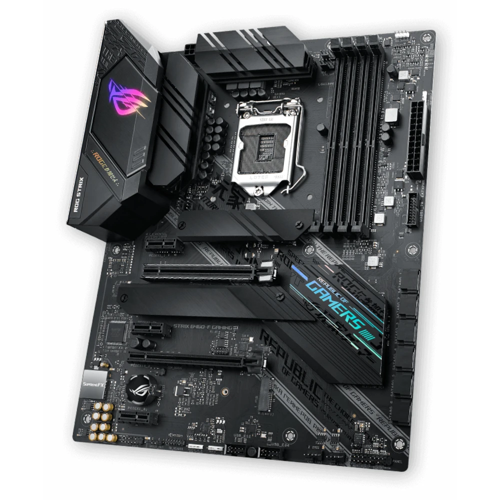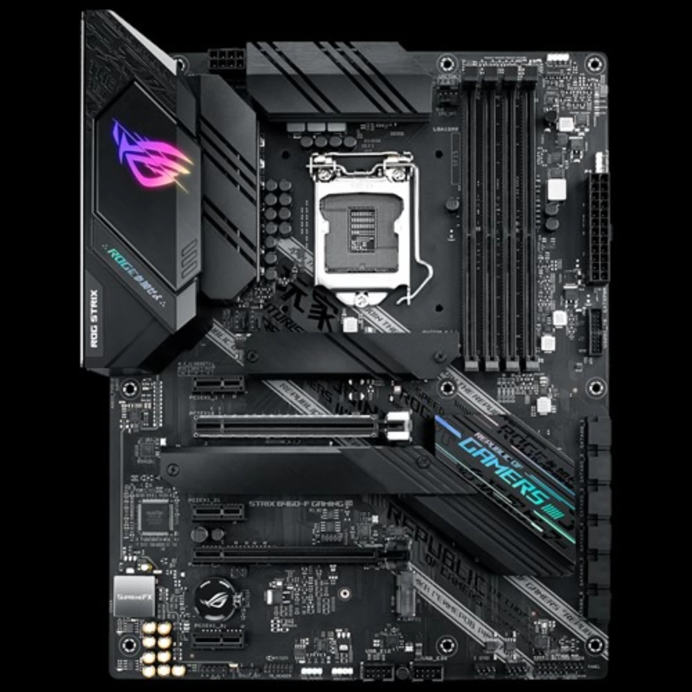 LGA 1200, Intel B460, 4 x DIMM, 2 x M.2, 6 x SATA-III, Gigabit Ethernet, USB 2.0, 6 x USB 3.2 Gen.1, USB 3.2 Gen.2 type-A, USB 3.2 Gen.2 type-C, HDMI, DP, ATX, 305 x 244mm ASUS ROG Strix B460-F Gaming. Processor manufacturer: Intel, Processor socket: LGA 1200 (Socket H5), Compatible processor series: Intel® Celeron® G, Intel® Core™ i3, Intel® Core™ i5, Intel® Core™ i7, Intel® Core™.... Supported memory types: DDR4-SDRAM, Maximum internal memory: 128 GB, Memory slots type: DIMM. Supported storage drive interfaces: PCI Express 3.0, SATA III, Supported storage drive types: HDD & SSD, RAID levels: 0, 1, 5, 10. Parallel processing technology support: 2-Way CrossFireX. HDMI version: 1.4b ROG Strix B460-F Gaming motherboard features solid power delivery and effective cooling designed to handle the latest 10th Generation Intel Core processors. With its arresting futuristic aesthetic and intuitive ROG software, ROG Strix B460-F Gaming gives you a head start on your dream gaming build.