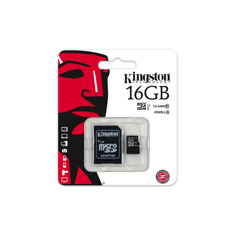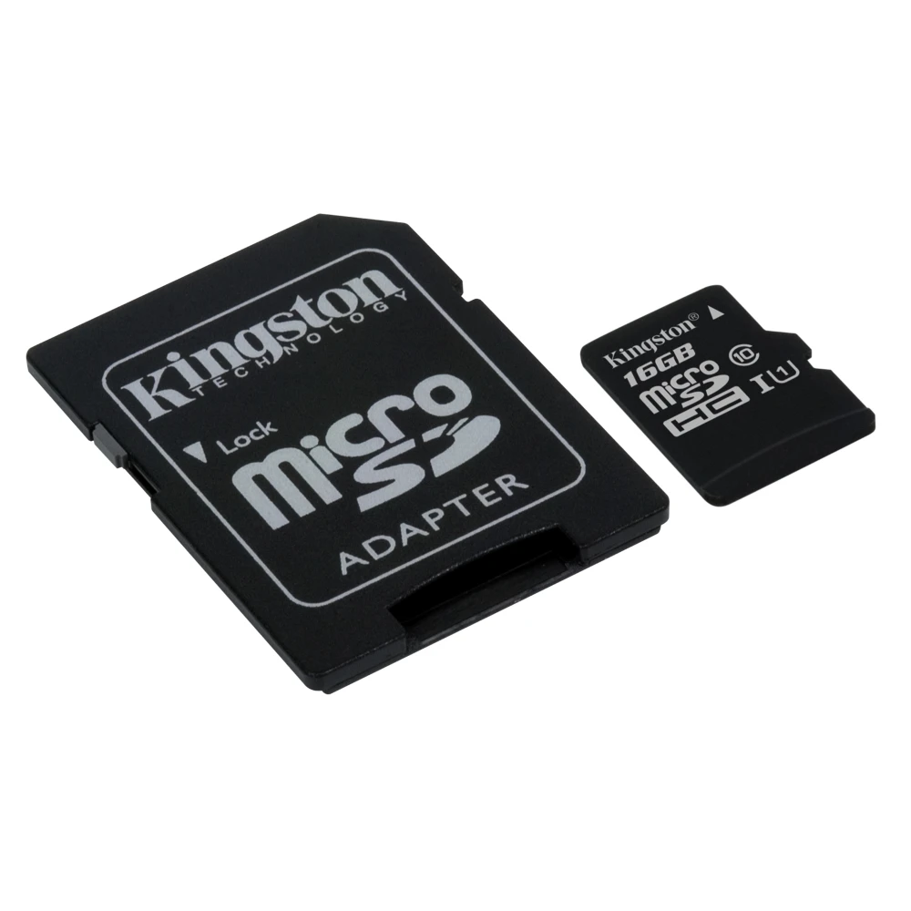 Kingston Technology microSDHC Class 10 UHS-I Card 16GB. Capacity: 16 GB, Flash card type: MicroSDHC, Flash memory class: Class 10, Internal memory type: UHS-I, Read speed: 45 MB/s, Write speed: 10 MB/s. Protection features: Temperature proof, Shock resistant, Vibration proof, Water resistant, Product colour: Black