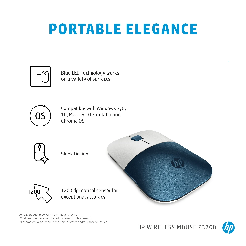 HP Z3700 Forest Teal Wireless Mouse. Movement detection technology: Optical, Device interface: RF Wireless, Movement resolution: 1200 DPI, Buttons type: Pressed buttons, Buttons quantity: 2, Scroll type: Wheel. Power source: Batteries. Product colour: Teal, White